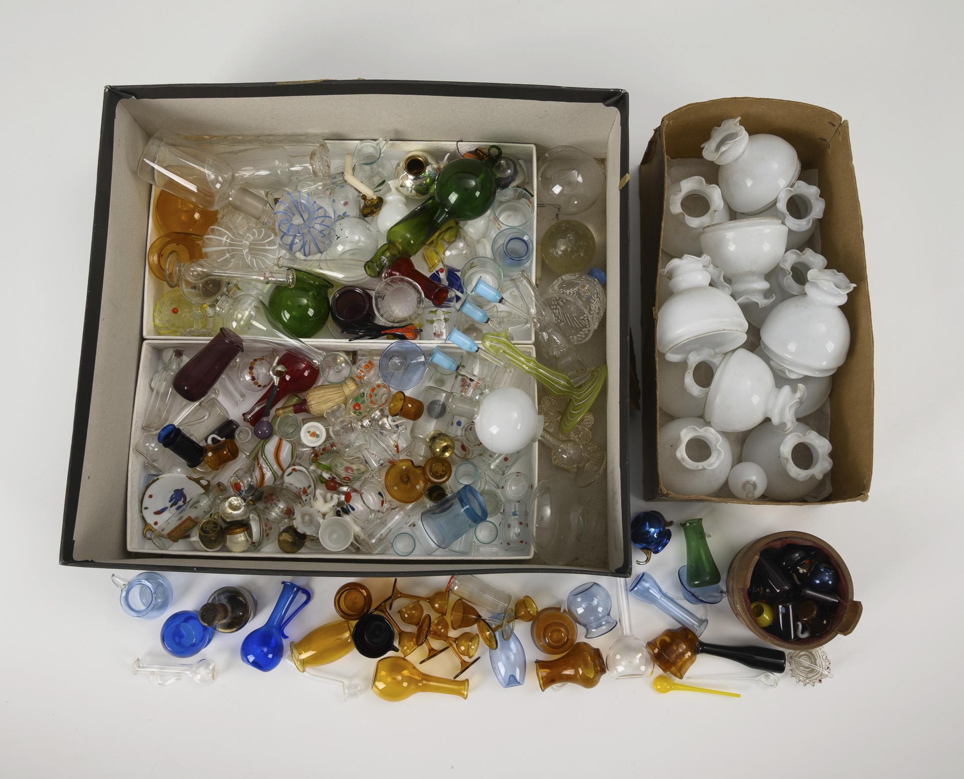 Verschiedenes Miniatur-Glas, darunter Petroleumlampenschirme aus Milchglas, Flaschen, Vasen, bemalte Serviceteile und 5x Fadenglas.