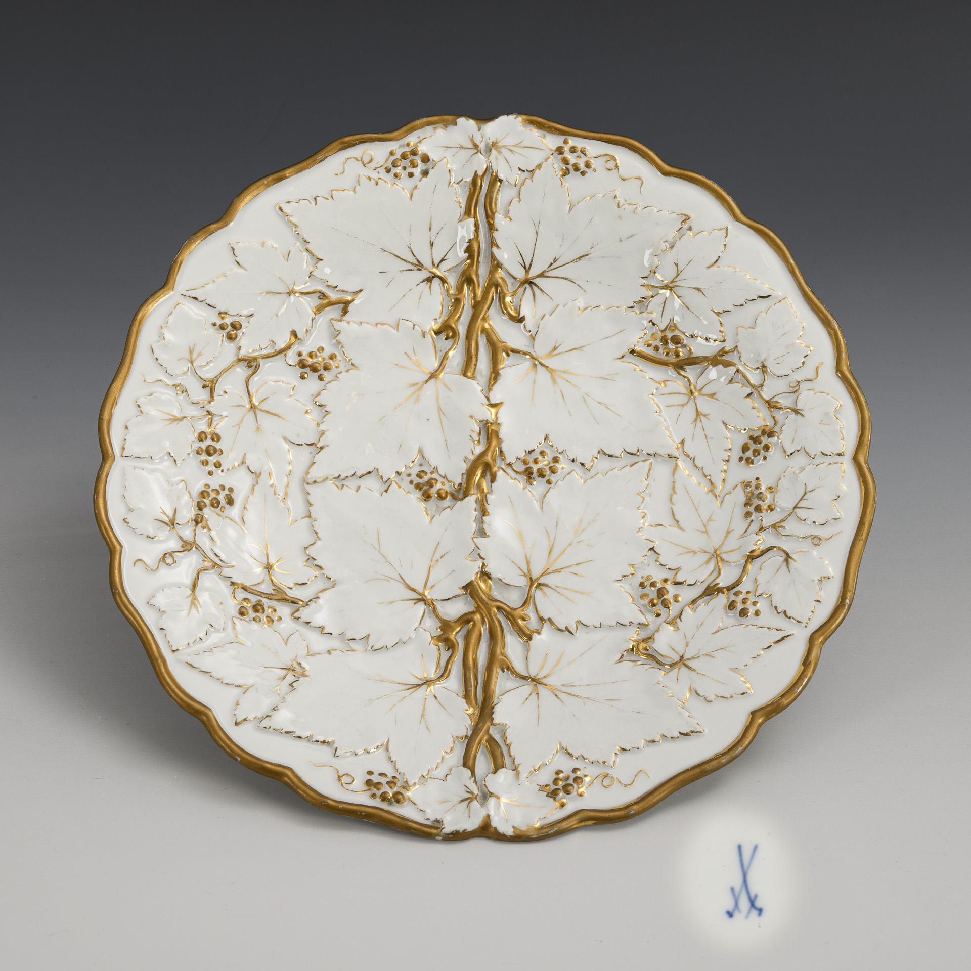 Teller mit goldstaffiertem Weinrebenrelief. Gold etwas berieben, Rand goldretuschiert.