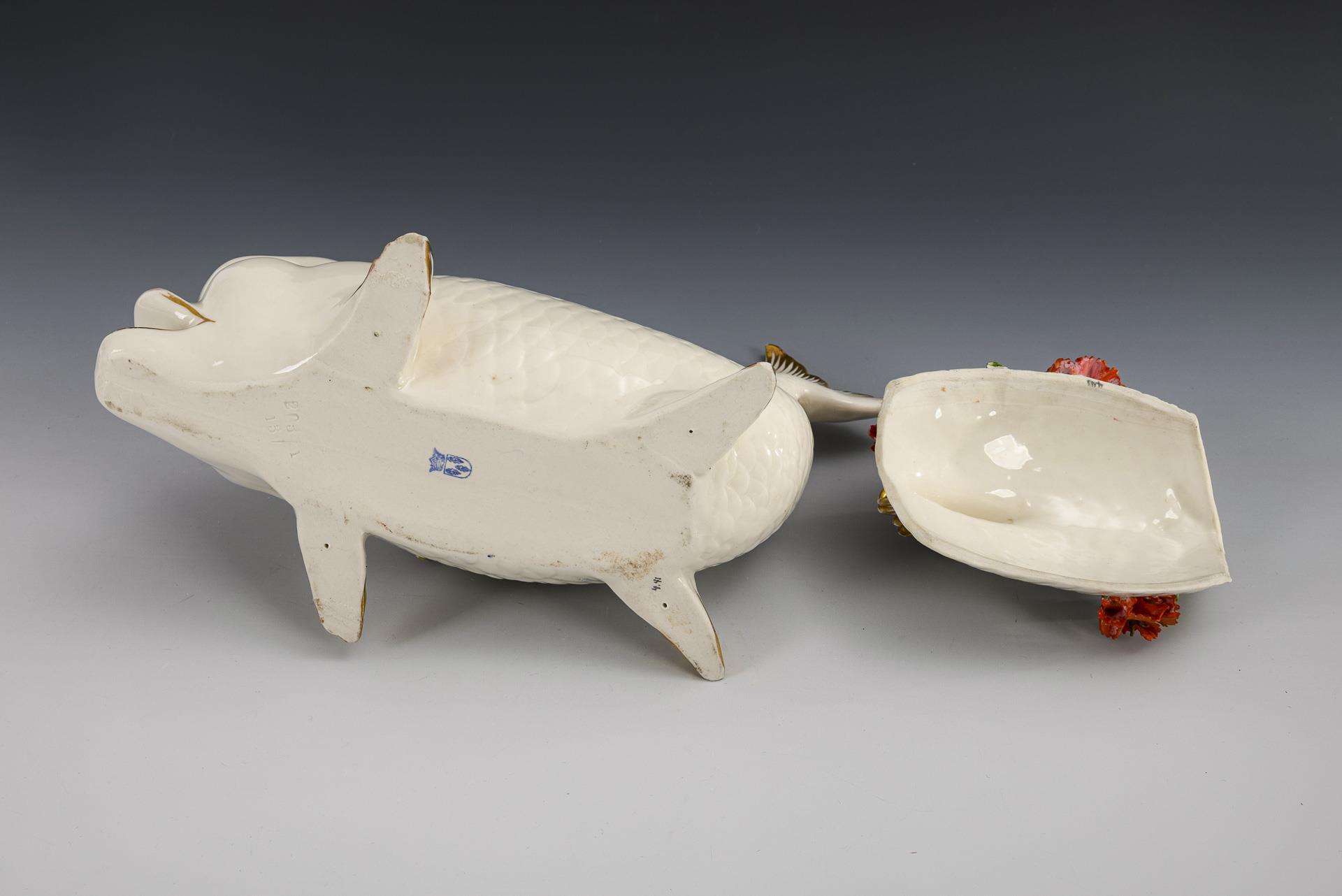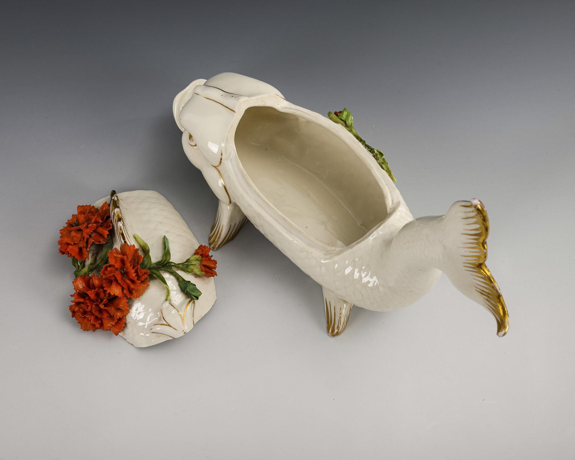 Dose in Form eines Fisches mit aufgelegten Nelken auf dem Deckel. Partieller Goldabrieb, Belag teils restauriert, Chips am Deckelrand.