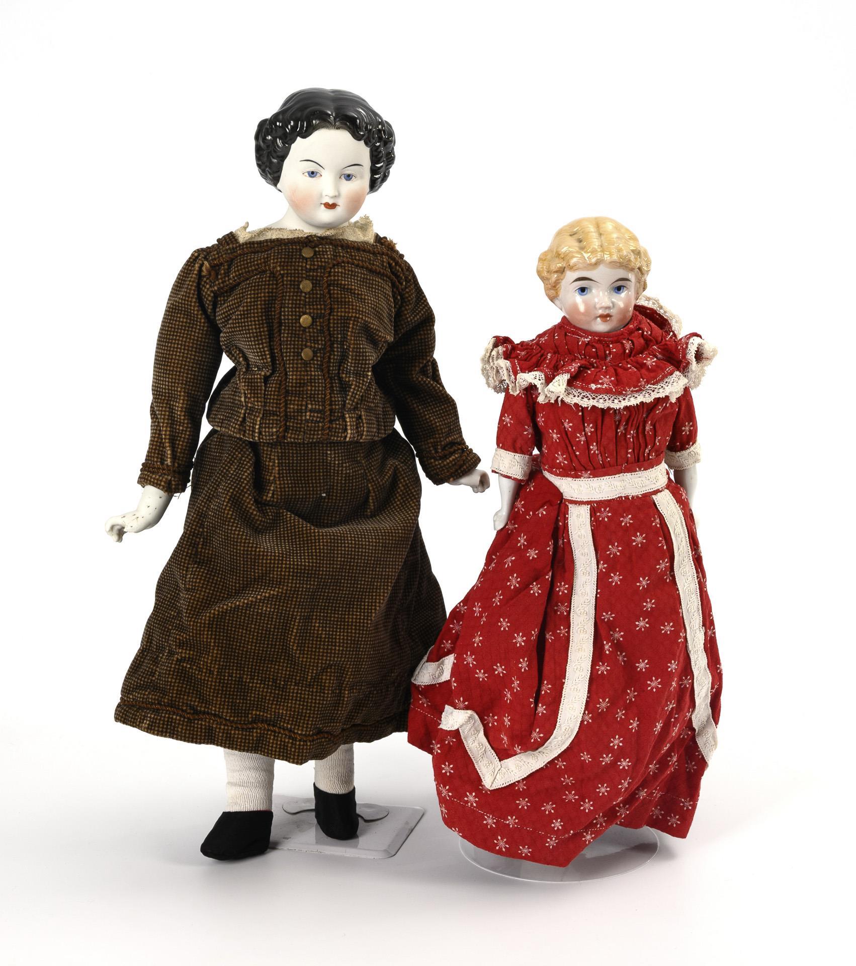 2-türiges Schränkchen mit Marmorplatte, Waschschüssel, Kannen, Seifenschalen und Zubehör. 25 x 28 x 17,5 cm. / Brustkopfpuppe mit weißem Biskuitgesicht, schwarzen glasierten Haaren, Lederkörper, Biskuitarmen und braunem Samtkostüm. 2 Finger bestoßen, L 40 cm. / Puppe mit glasiertem Brustkopf, modellierten blonden Haaren, Lederkörper, glasierten Porzellanarmen und rotem Kleid, L 36 cm. Bespielt, mit Altersspuren und Defekten.