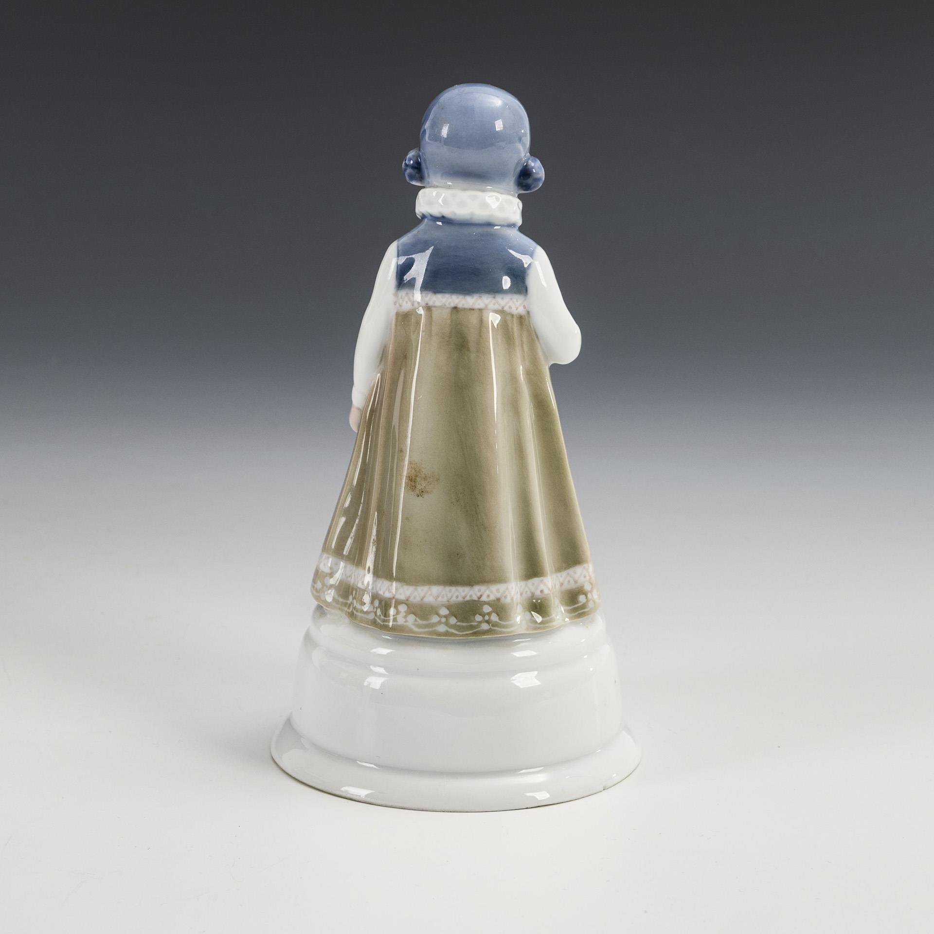 "Gratulantin". Auf einer hohen Rundplinthe stehendes Trachtenmädchen mit Blumensträußchen.