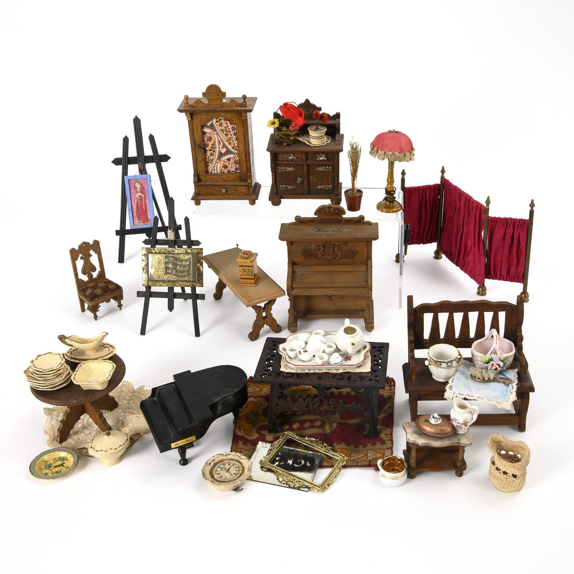 8 verschiedene Gründerzeit-Möbel, Klavier als Spardose, kleiner schwarzer Flügel, 2 Staffeleien, Stoff-Paravent, dazu etwas Geschirr und Zubehör.