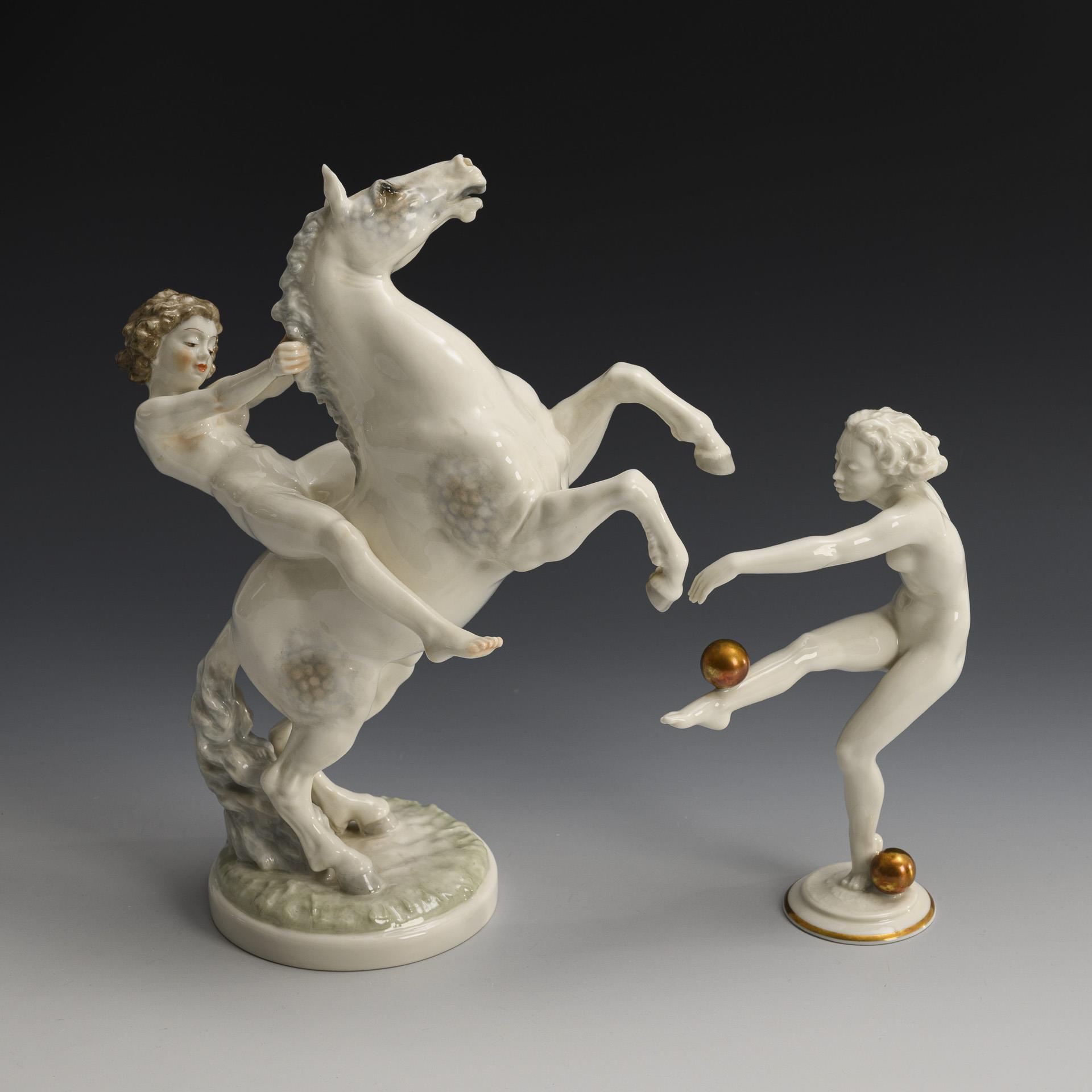 1x Entwurf von Carl Tutter (1883-1969): auf einem steigenden Schimmel reitender Frauenakt. / 1x Entwurf von Carl Werner (1895-1980): mit zwei goldenen Bällen tanzender Frauenakt.