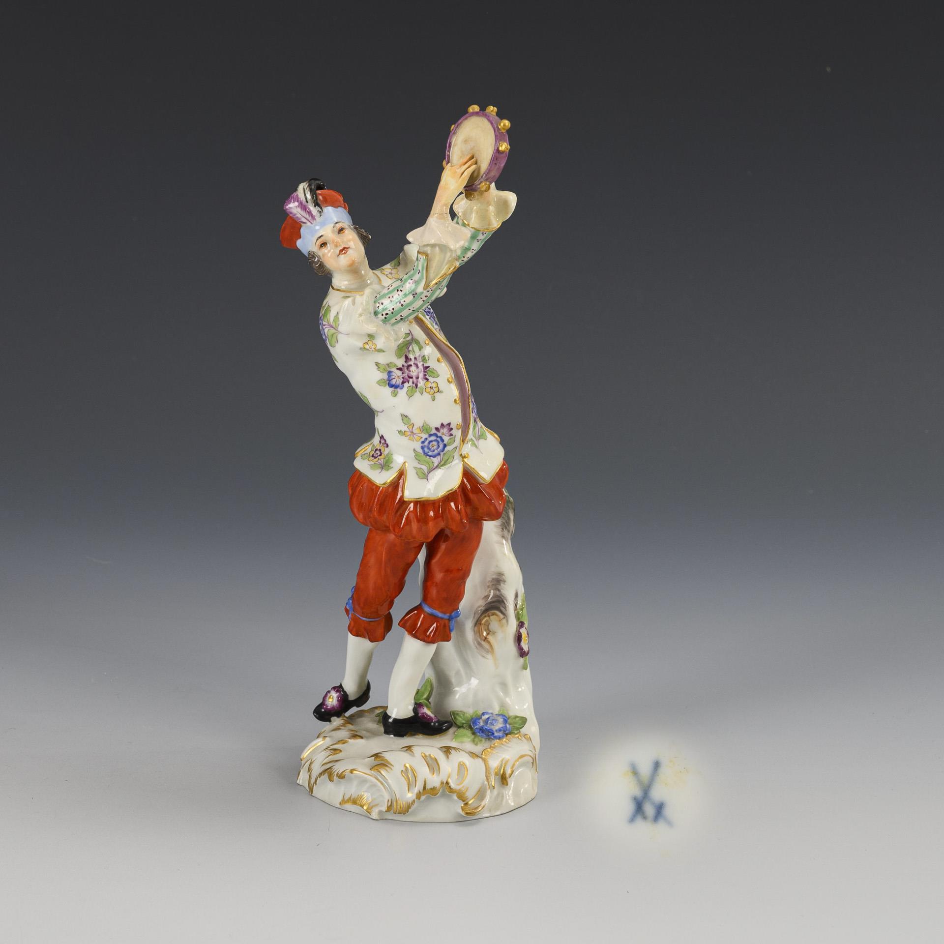 An einem Baumstamm stehender, ein Tambourin spielender junger Mann. Hände geklebt und farbretuschiert.