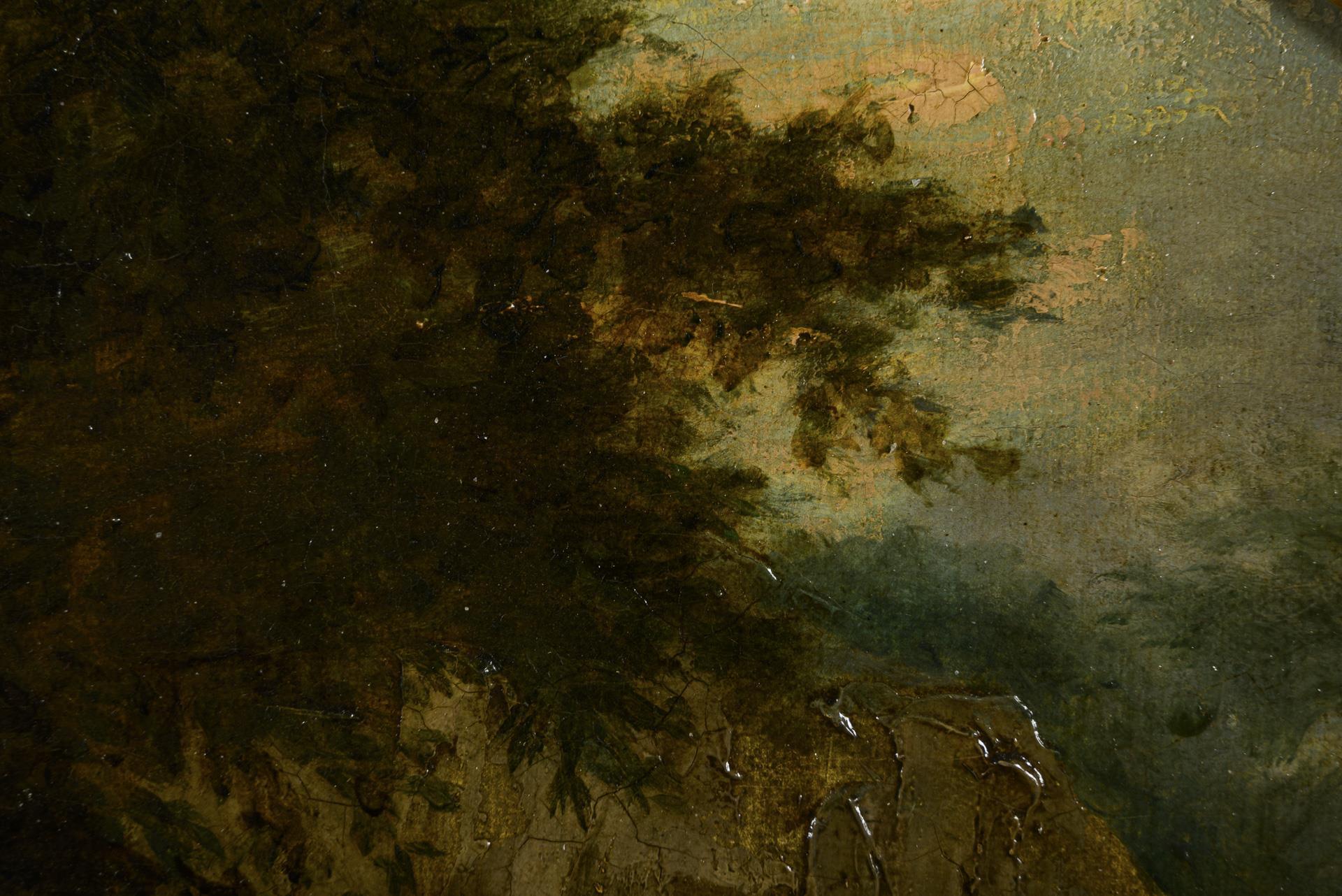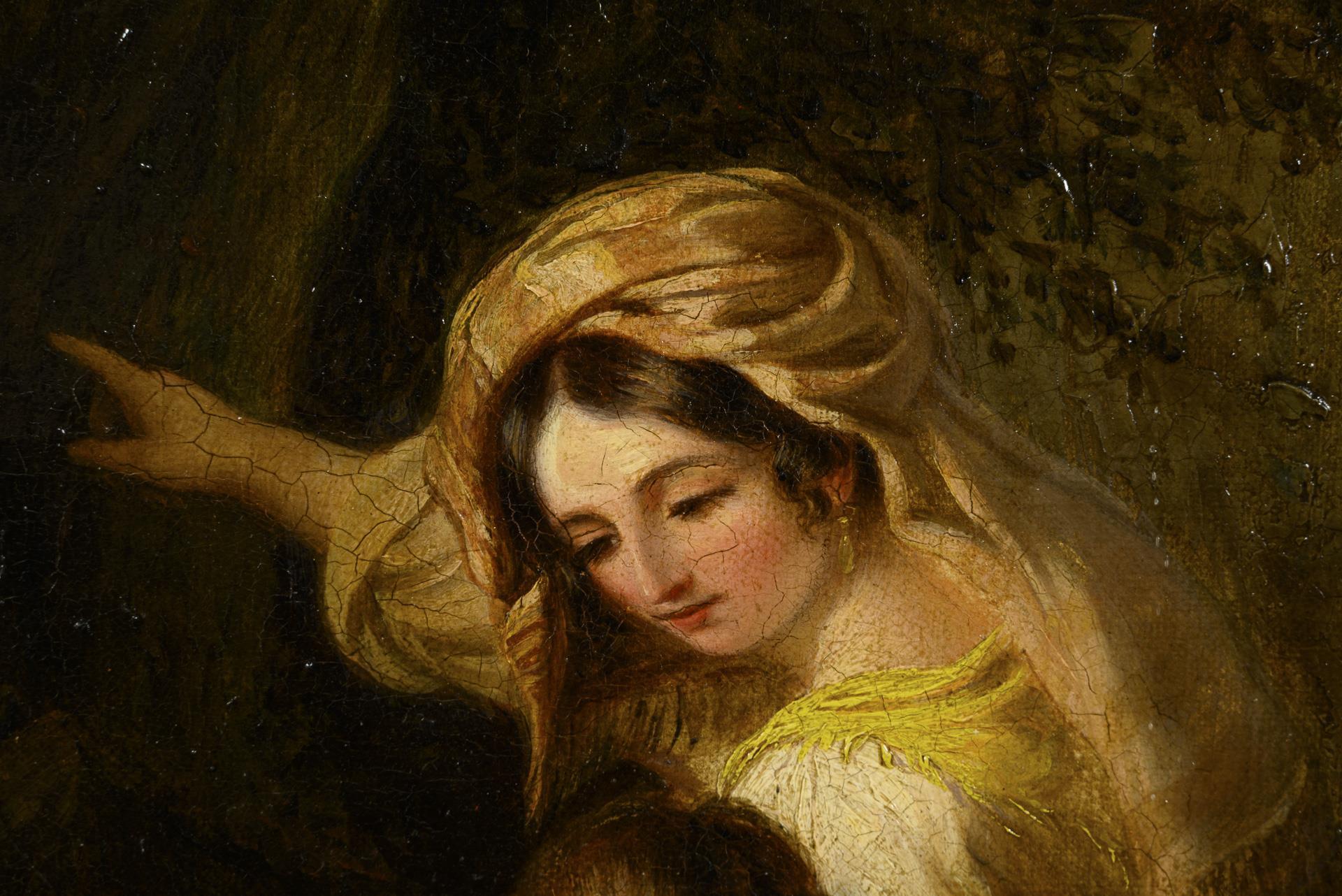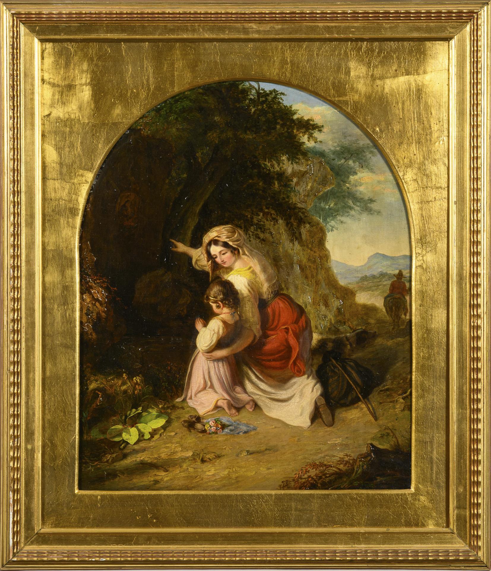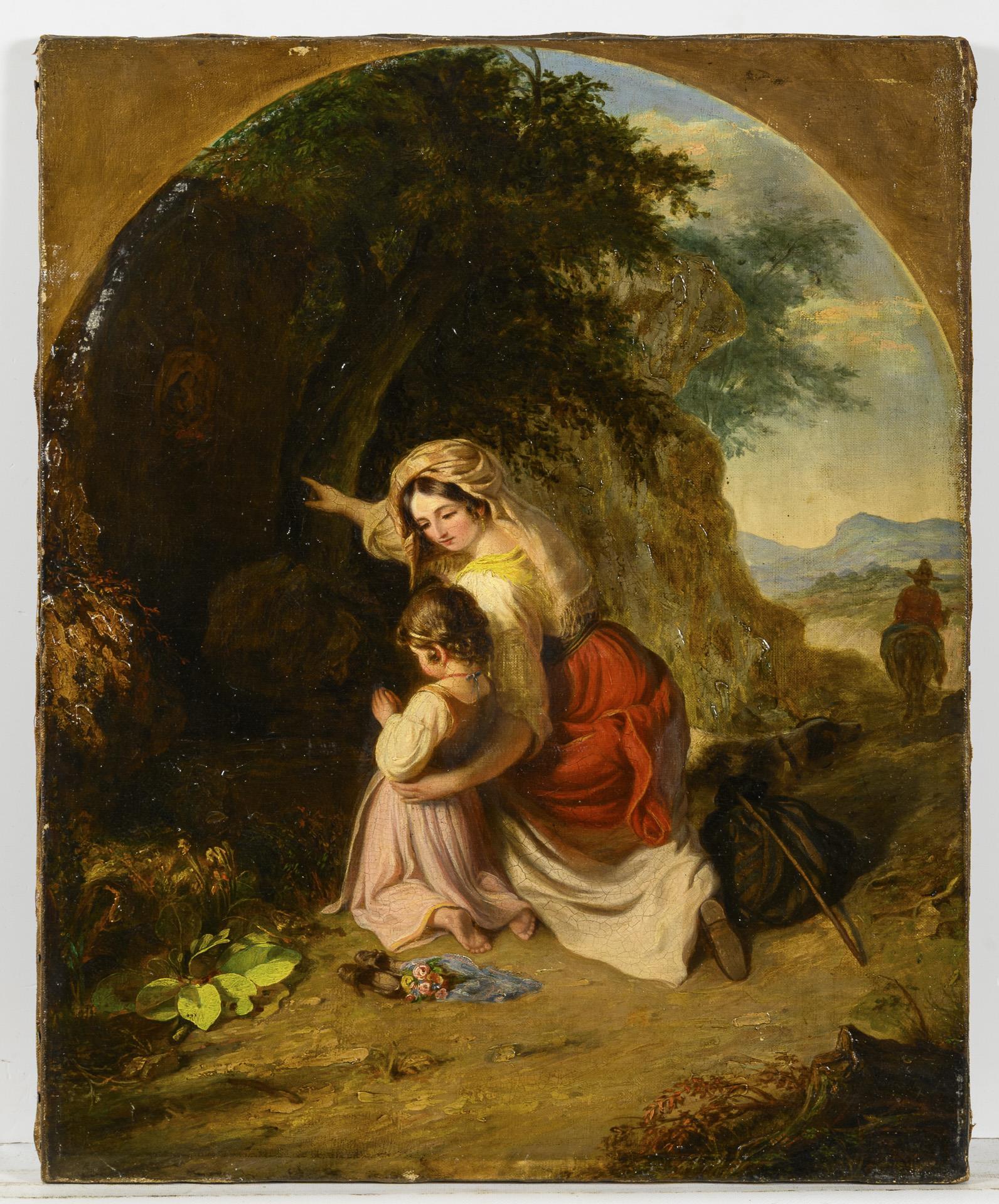Die Mutter beim Anhalten des Kindes zum Beten vor dem Madonnenbild in der Felsennische. Es gibt ein Gegenstück dazu mit Mutter und Knabe. Minimale Altersspuren.