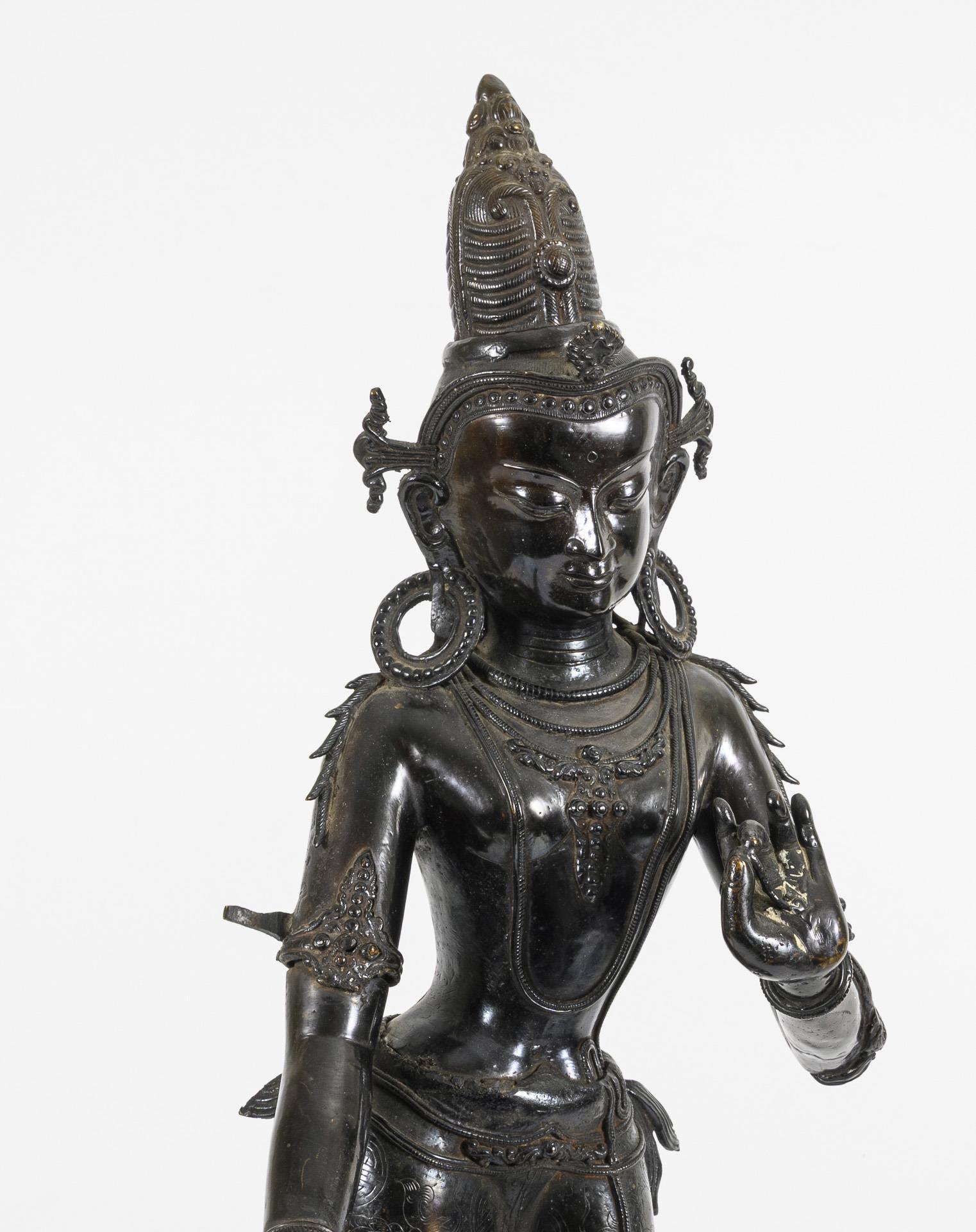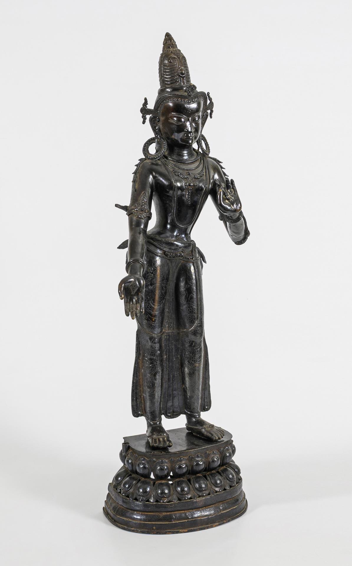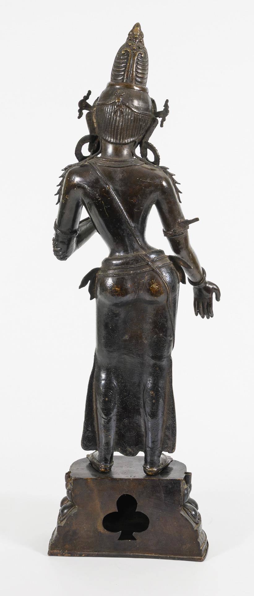 Stehende Heiligenfigur mit Schmuckelementen und hoher Kopfhaube. Auf der Gewandrückseite Schriftzeichen für "langes Leben". Auf doppeltem Lotossockel, dieser an der Rückfront mit Kleeblattöffnung und zwei seitlichen Tüllen für weitere Elemente. Figur aus mehreren Teilen zusammengefügt, Sockel abnehmbar.