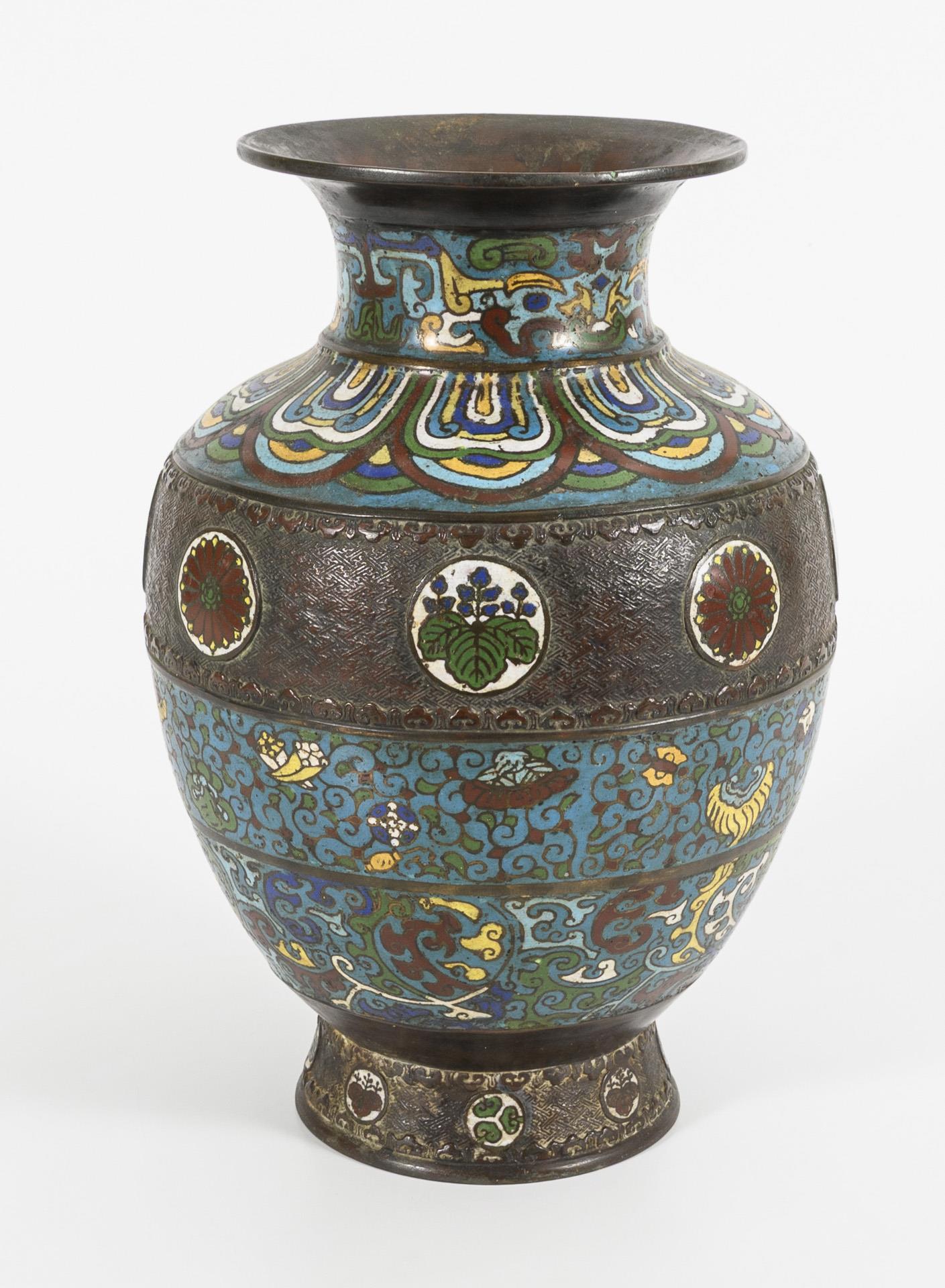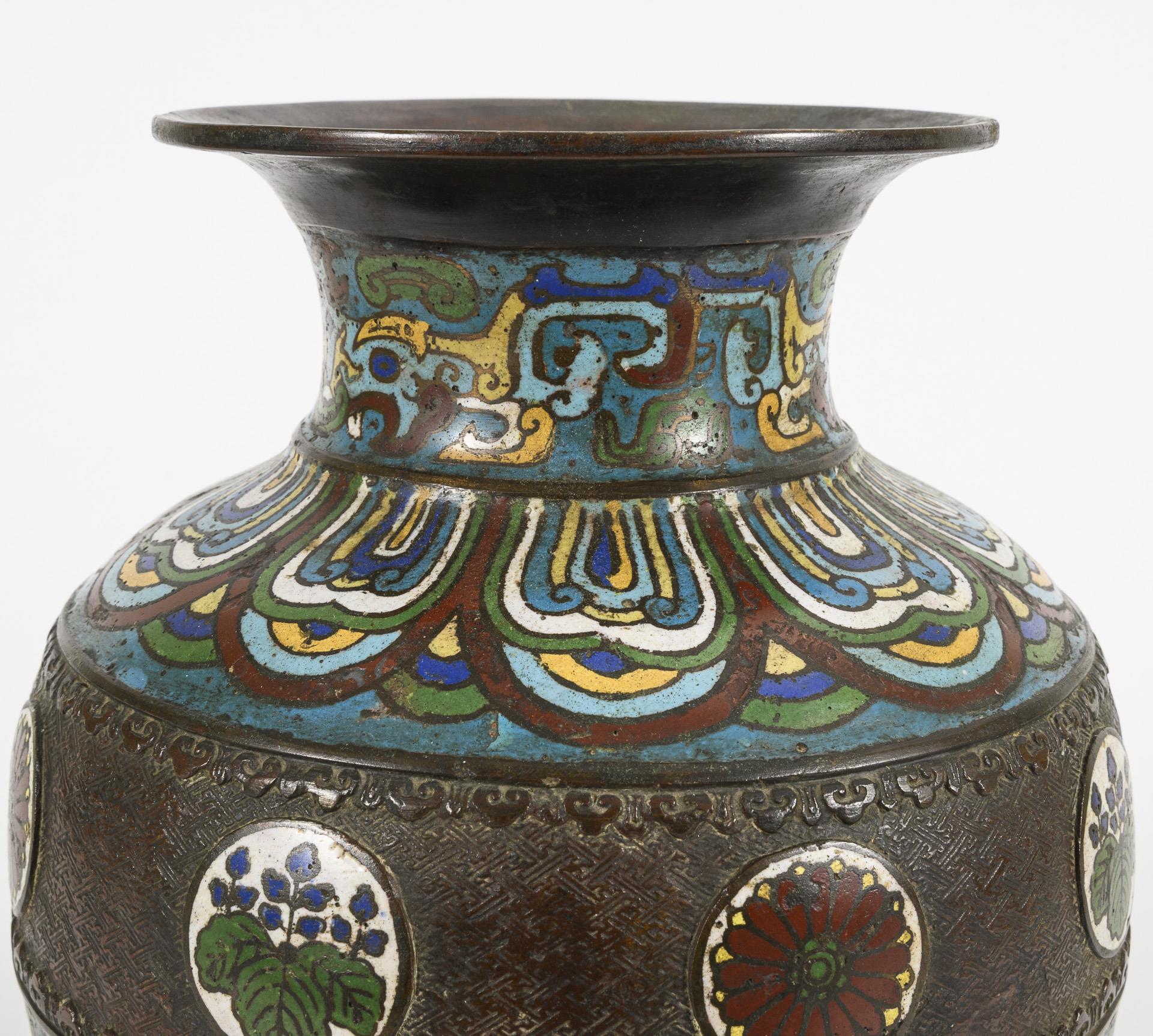 Balusterform mit floralen Ornamenten und kreisförmigen Blumenkartuschen auf reliefiertem Untergrund. Boden an den Rändern mit undichter Lötspur. Email leicht blasig und teils mit flachen Chips.