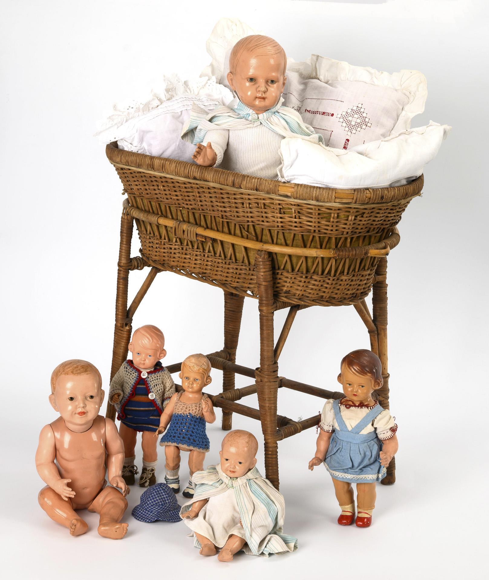 Umfangreiches Konvolut mit Puppen verschiedener Hersteller, darunter Schildkröt, Cellba, Bruno Schmidt etc. L 18 - 42 cm. Dazu ovaler, geflochter Korb auf Rattanständer, 54 x 55 x 32 cm. Mit Defekten und Reparaturstellen.