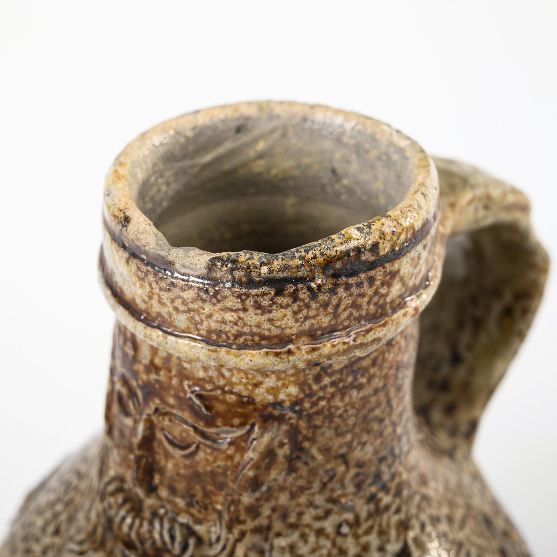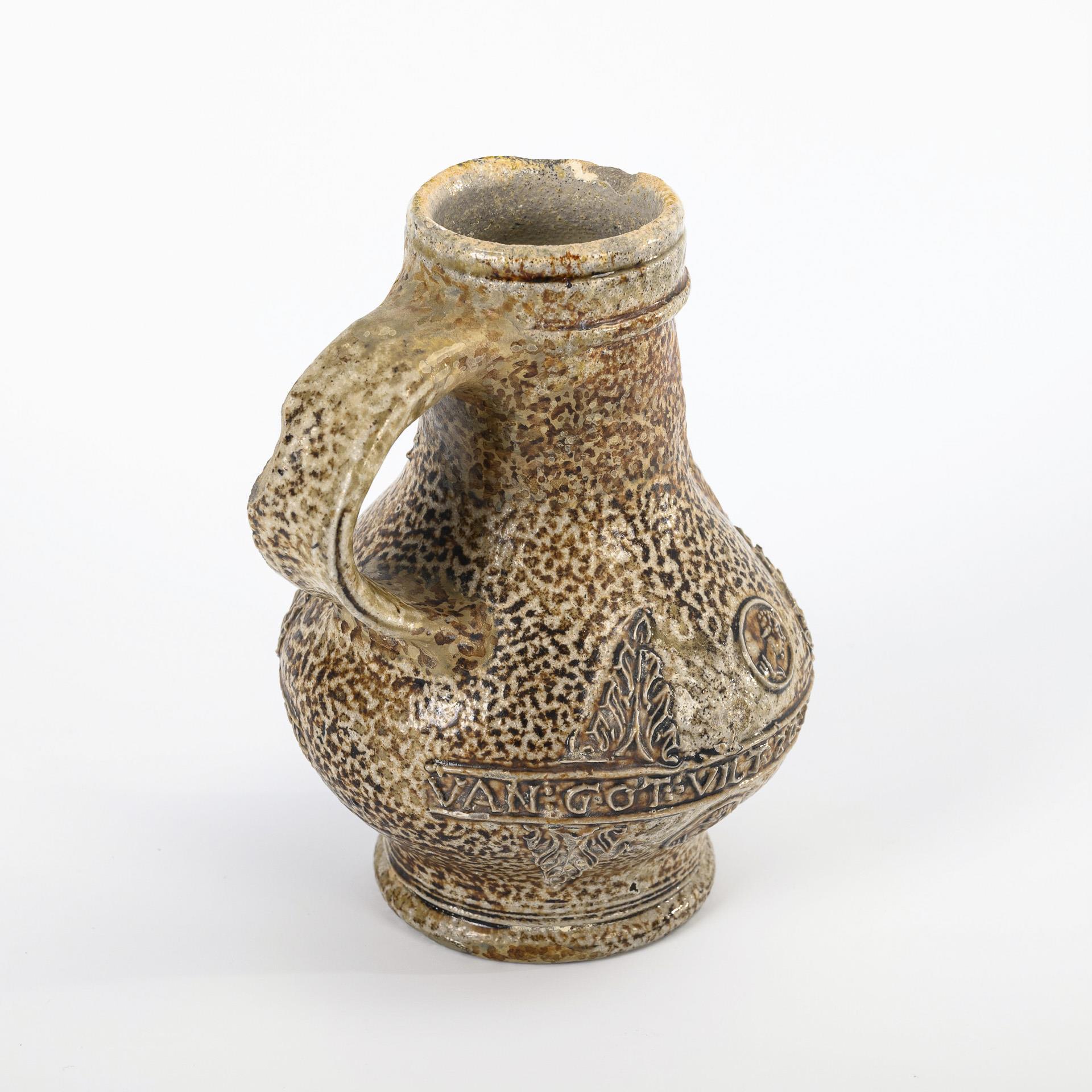 Gedrückt bauchiges Kugelbauchgefäß mit gerilltem Enghals und Bandhenkel mit glatt ausgestrichenem Ansatz. Auflagendekor mit Bartmaske und umlaufendem Spruchband "Van Got Vilt So Ist Mein Zil", Akanthusblättern sowie kleinen Rundmedaillons mit dem Profil einer antikisierenden Figur. Restauriert, partiell bestoßen.