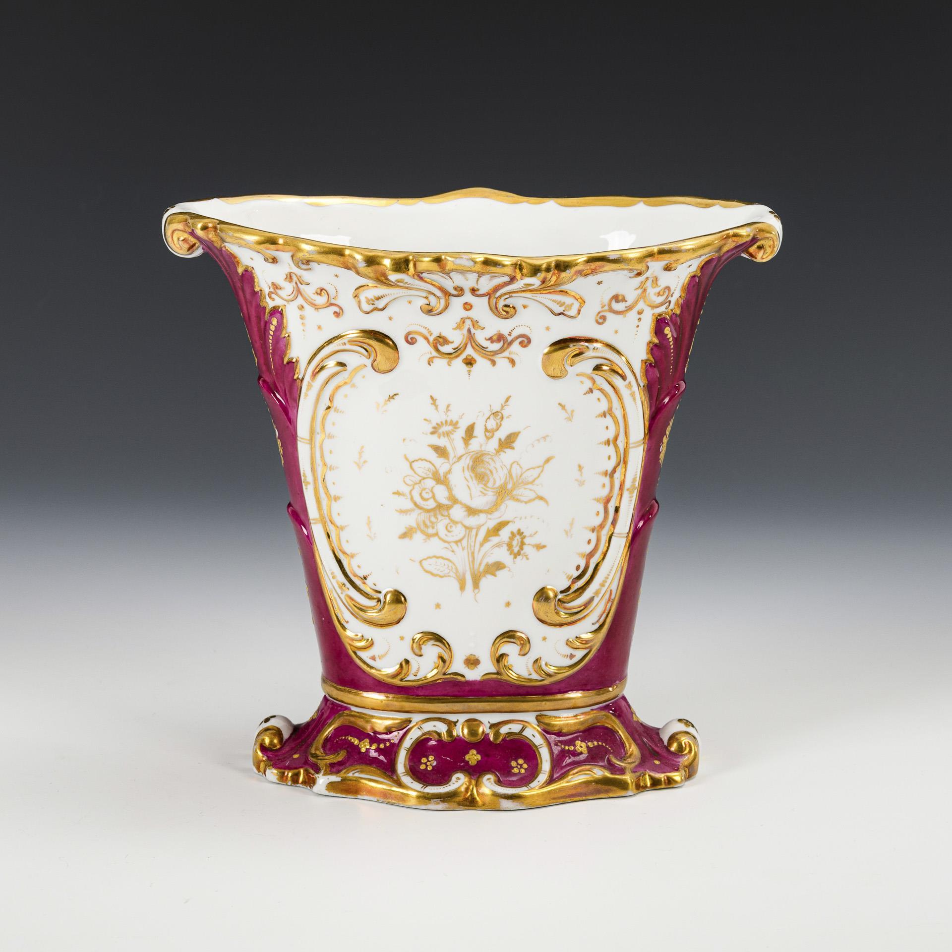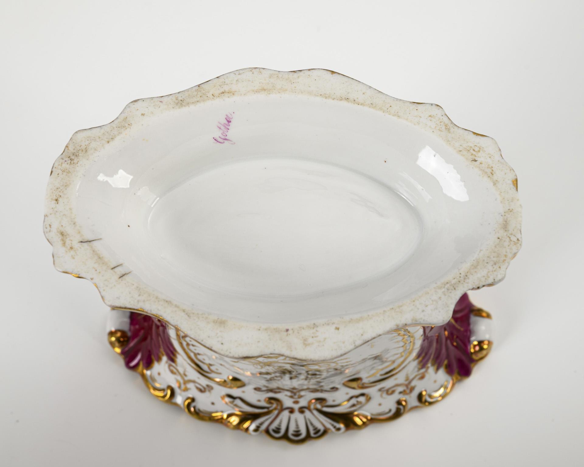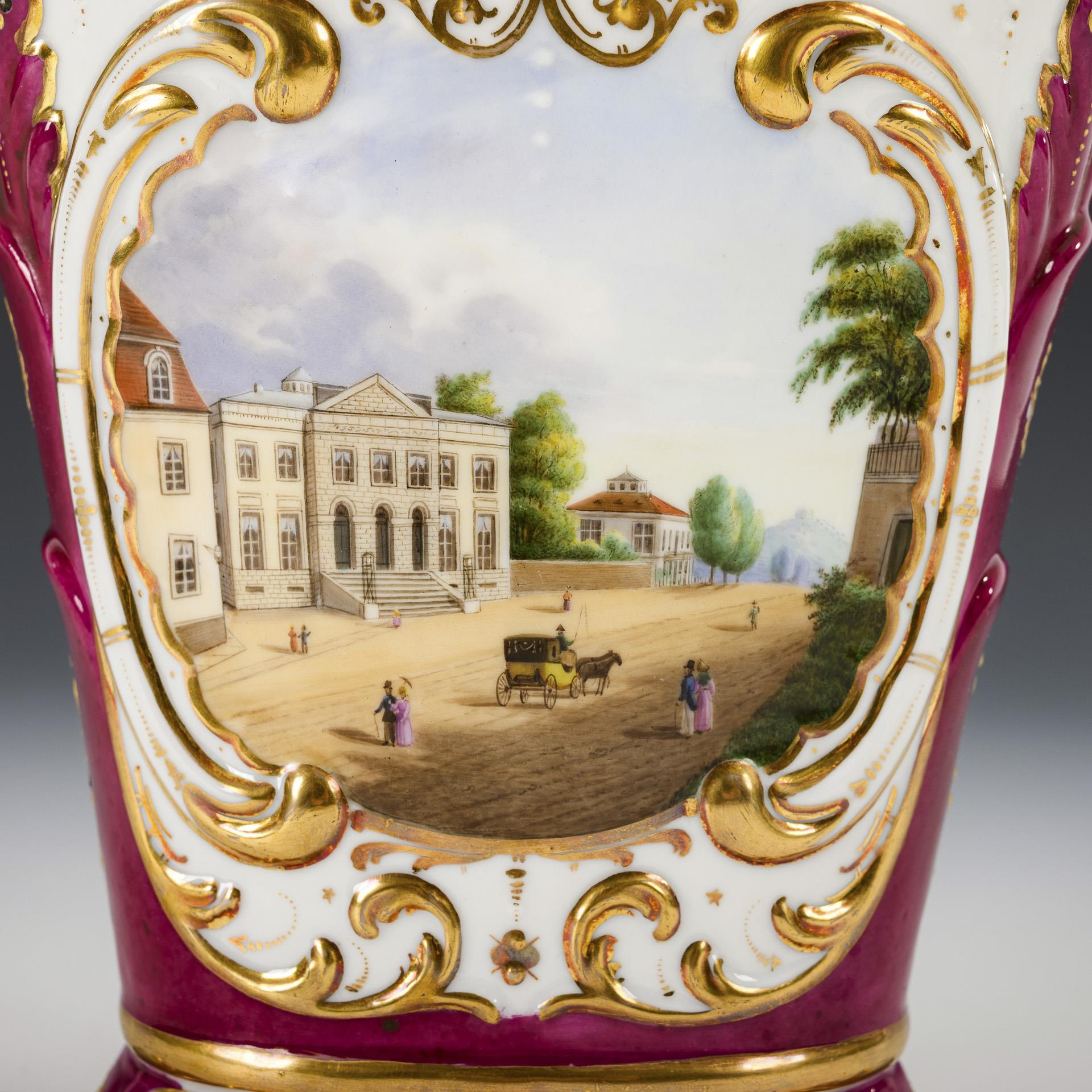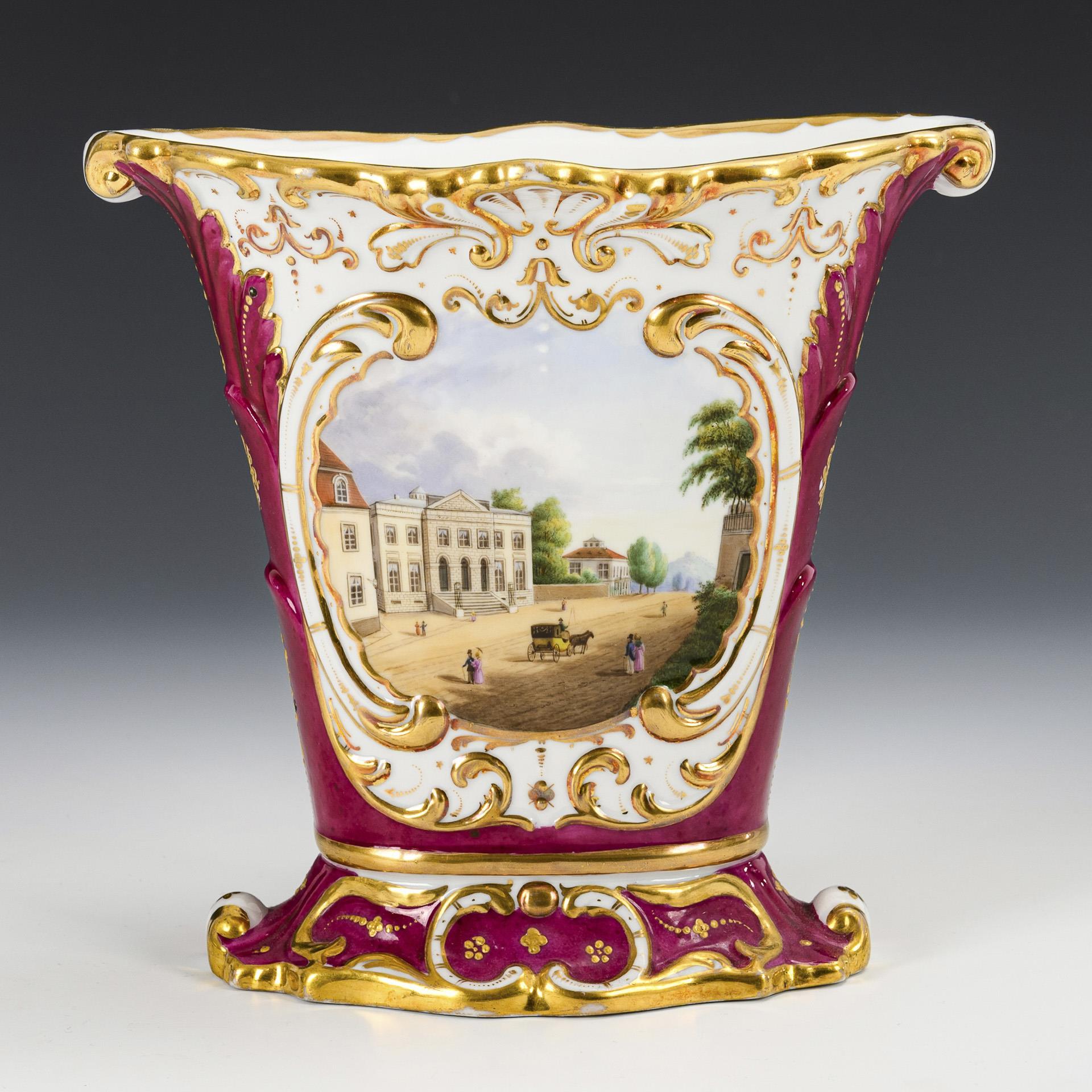 Krater-Plattvase mit Rocaillerelief. Purpurfarbener Fond, schauseitig die Ansicht des Prinzenpalais in Gotha, verso florale Goldmalerei. Partieller Goldabrieb.