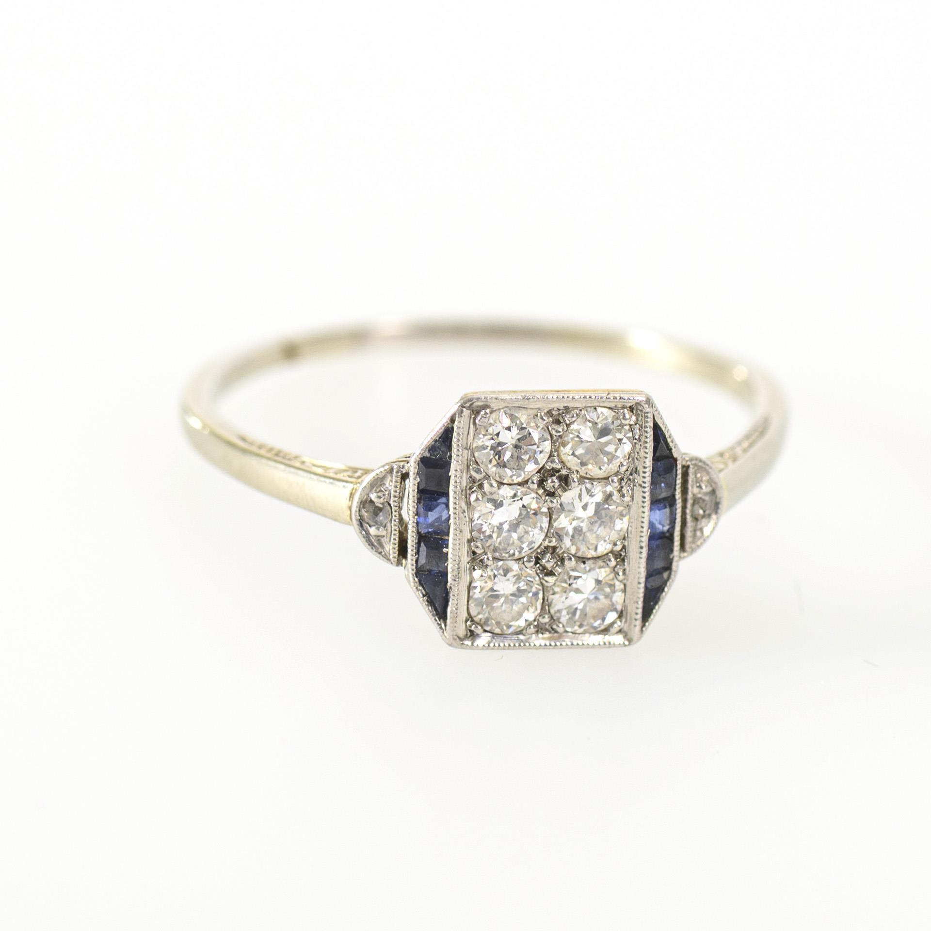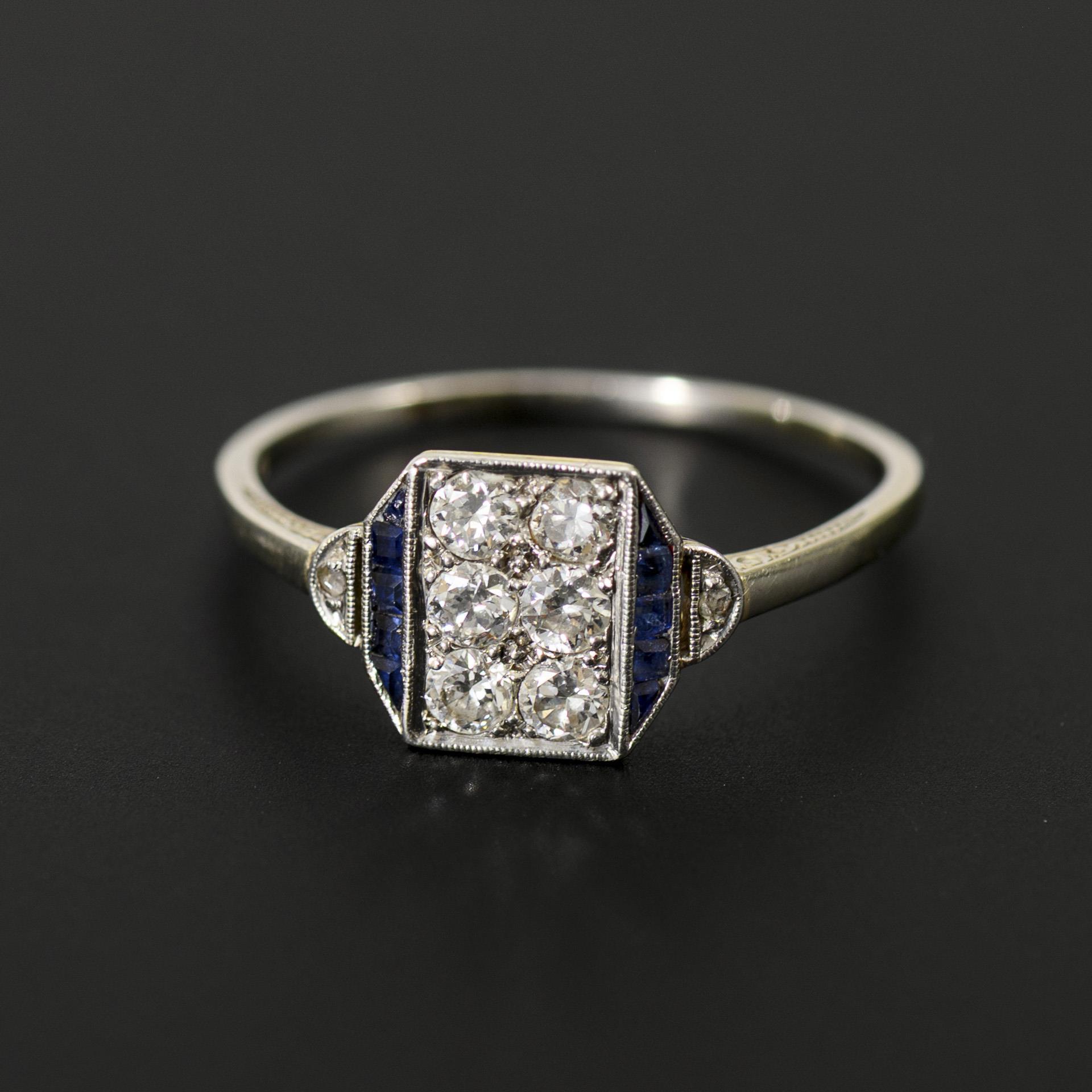 Zarter Art déco-Ring mit rechteckig angelegtem Ringkopf, dieser besetzt mit 6 Brillanten und kleinen, blauen Farbstein-Carrés, wohl Saphire, mit je einem kleinen Diamanten am Ansatz der Ringschultern. Unterseitig vormalige Erweiterung der Ringschiene sichtbar, ein kleiner blauer Farbstein mit Beschädigungen, dies kaum augenfällig.