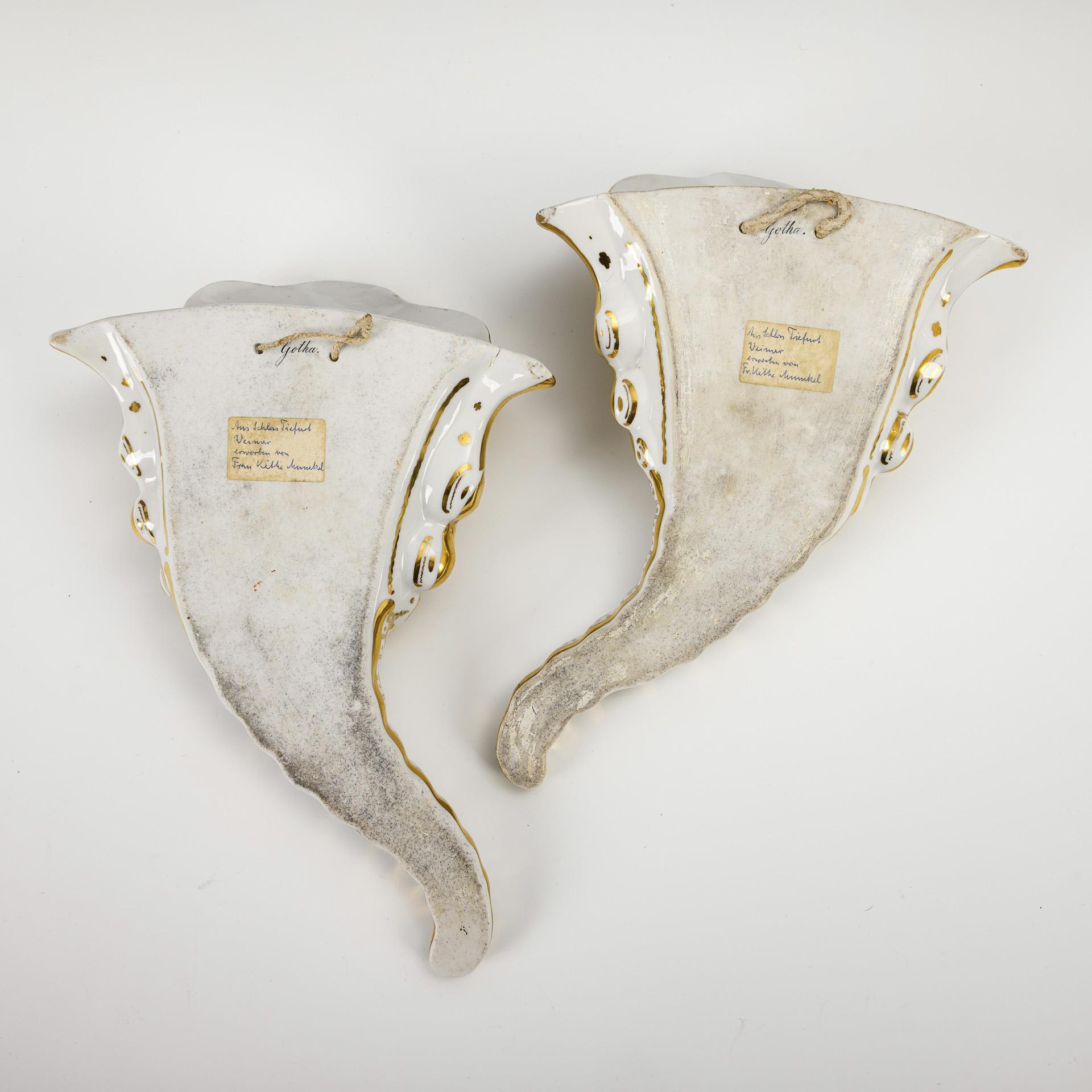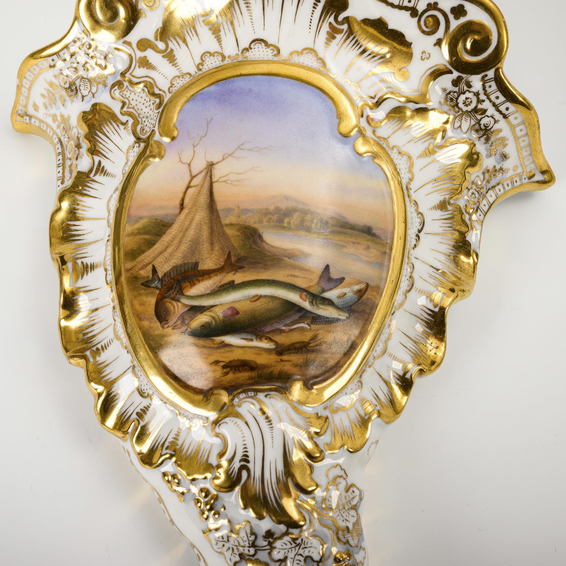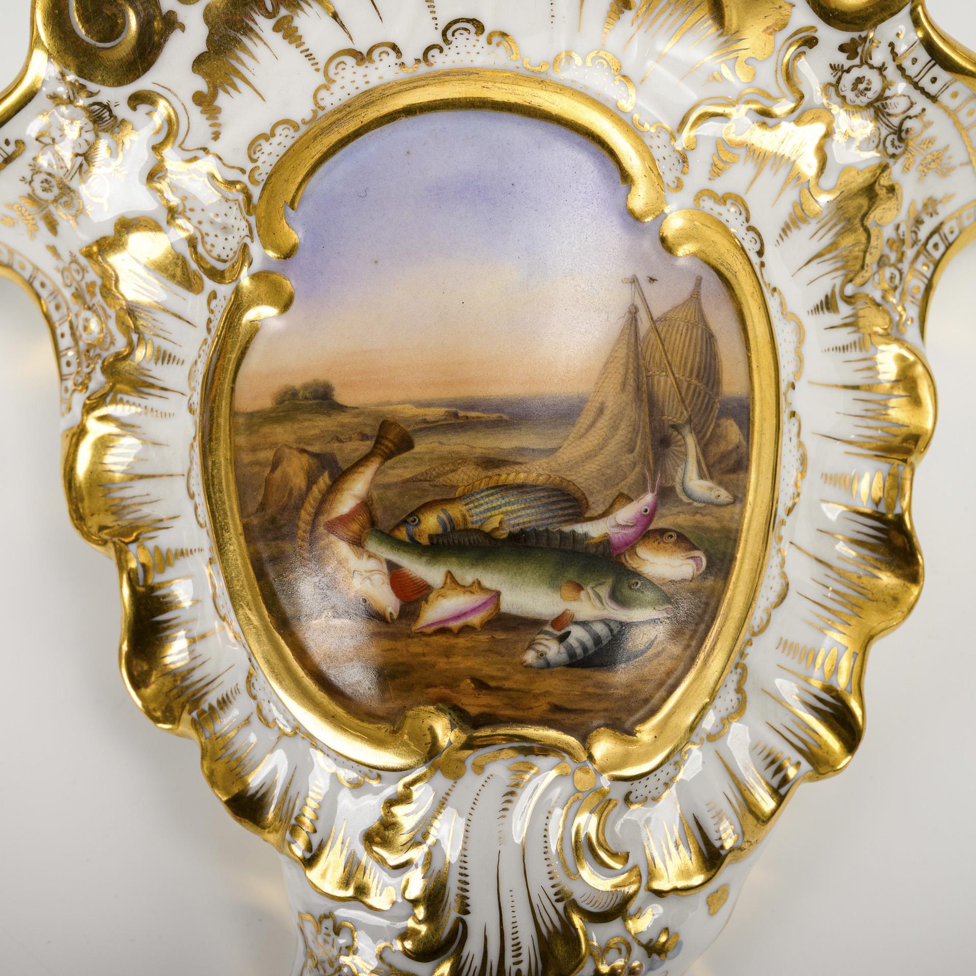 Wandvasen in Form eines rocaillereliefierten Füllhornes. Schauseitig eine Kartusche mit der Darstellung einer Küstenlandschaft mit vor Fischnetzen und Reuse liegenden Fischen.