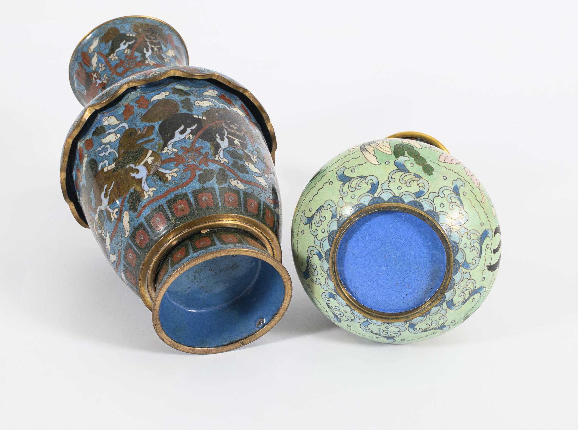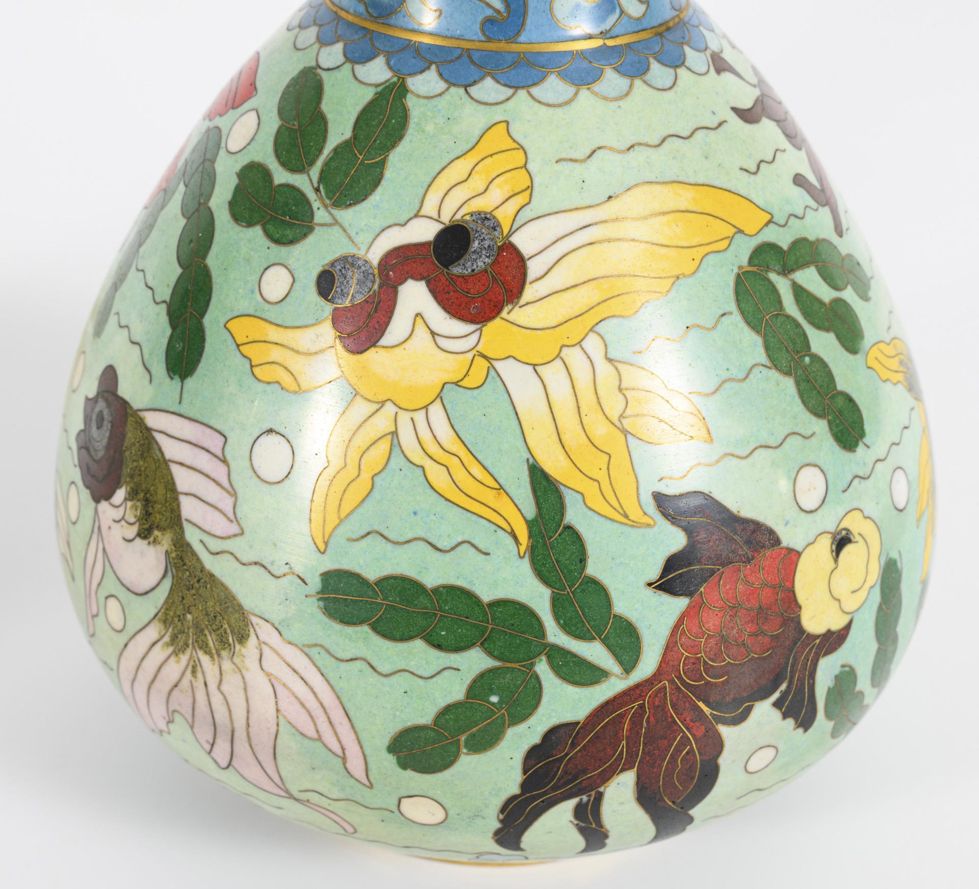 Ungewöhnliche Balustervase mit gewellter und überhängender Schulter. Verschiedene stilisierte Fabelwesen als Dekor, auf blauem Grund. H 31 cm / Tropfenvase mit farbenfreudigem Fischdekor. H 25,5 cm.