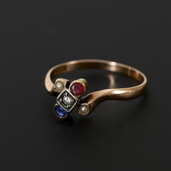 Origineller Ring mit Besatz aus einem roten sowie einem blauen Farbstein, 2 halben Saatperlen und einem Brillanten. Leichte Alters- und Tragespuren; blauer Stein mit sichtbarem Chip (Stein hält sicher in der Fassung).