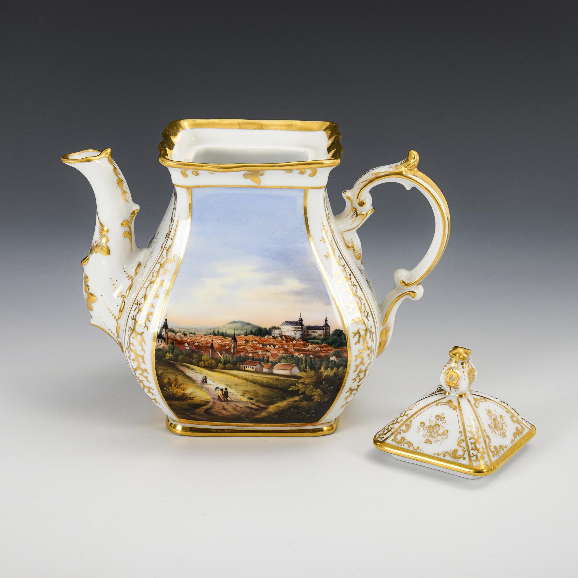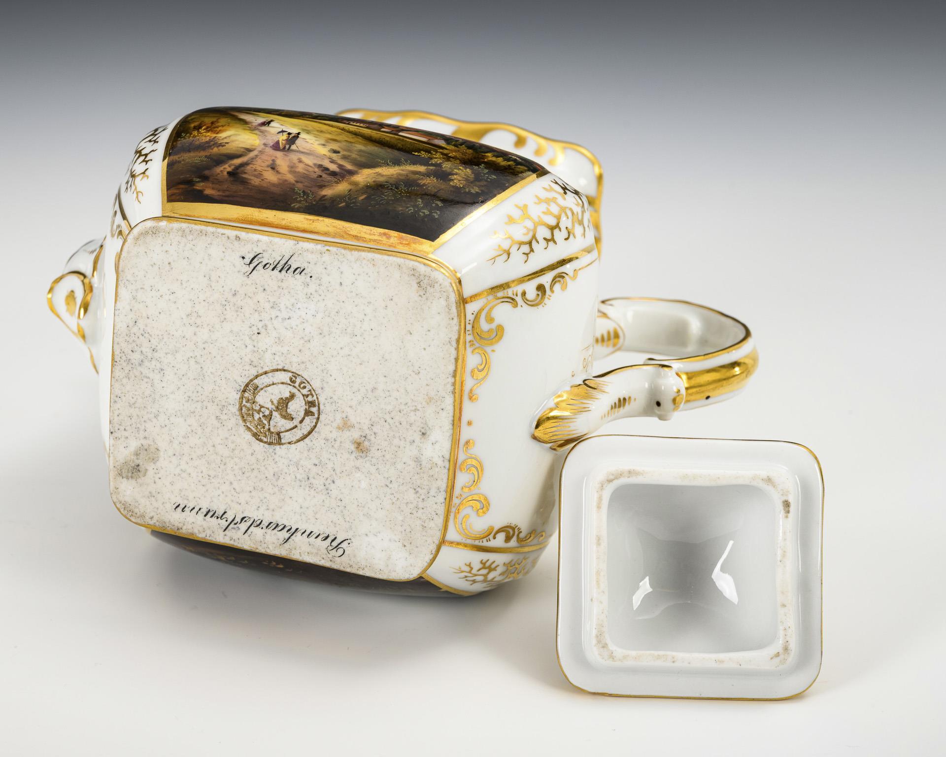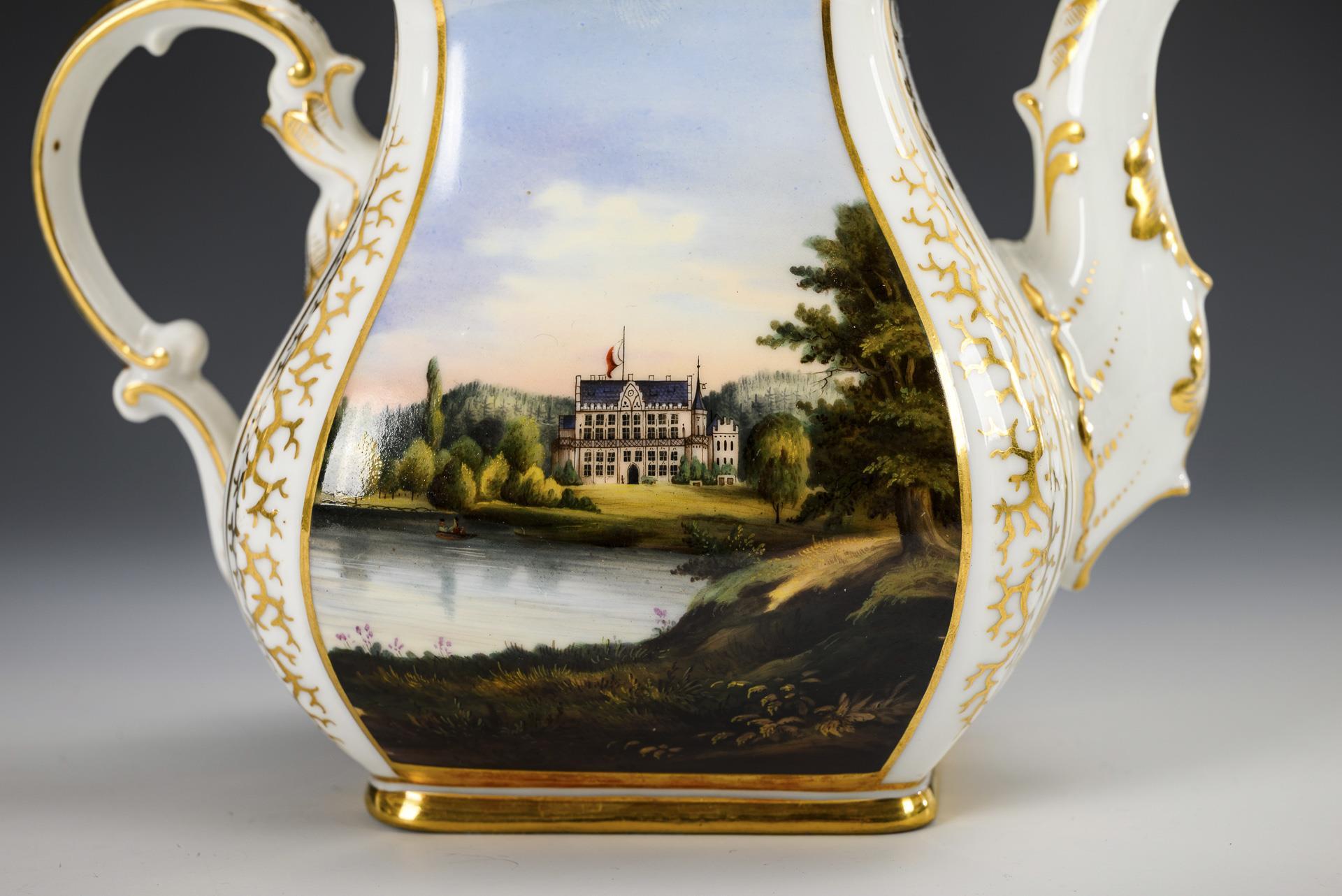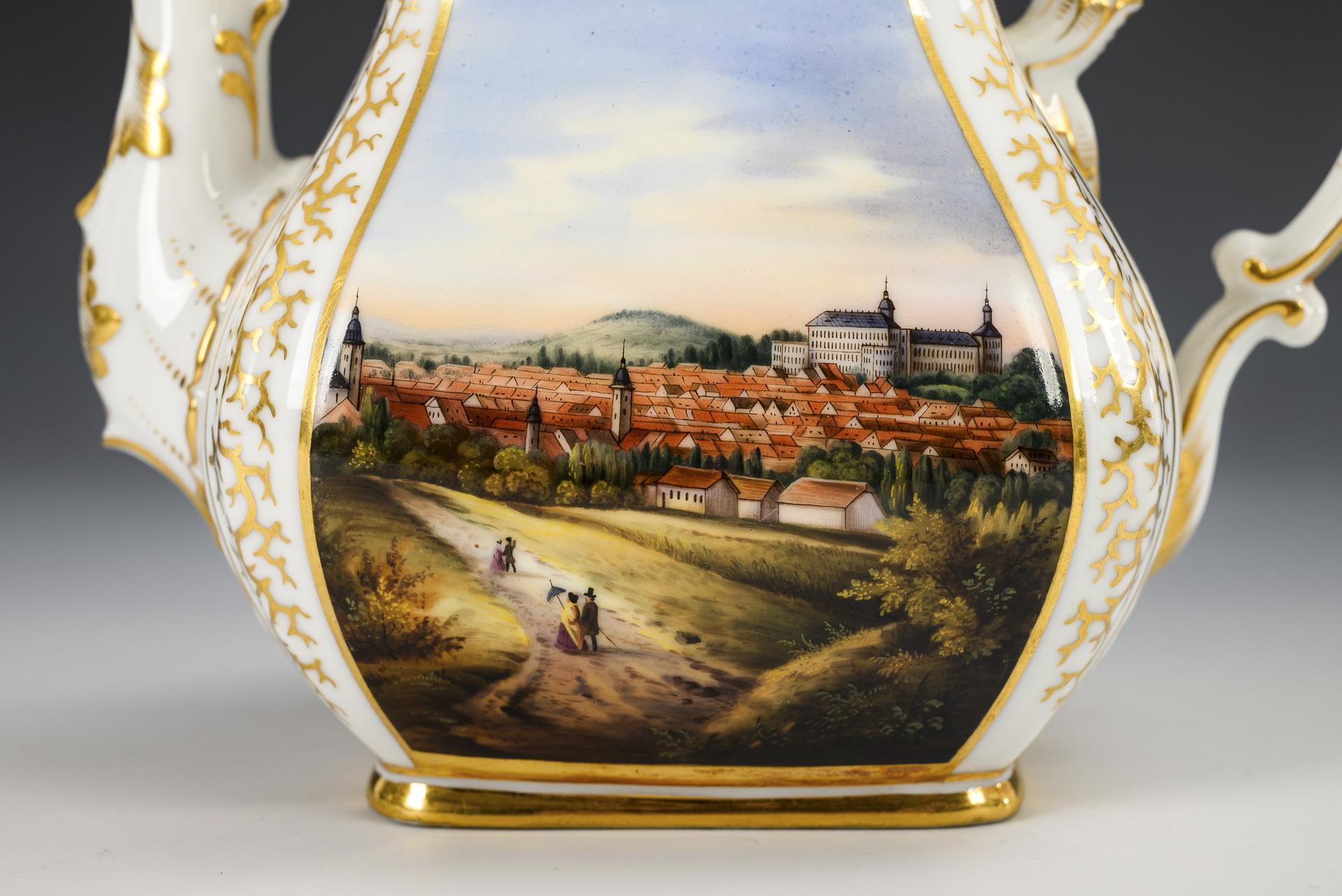 Quadratisch-balusterförmige Kanne mit Rocaillehenkel und -schneppe sowie Knaufdeckel. Beidseitig eine fein gemalte, unterseitig bezeichnete Ansicht der Stadt Gotha bzw. des Schlosses Reinhardsbrunn.