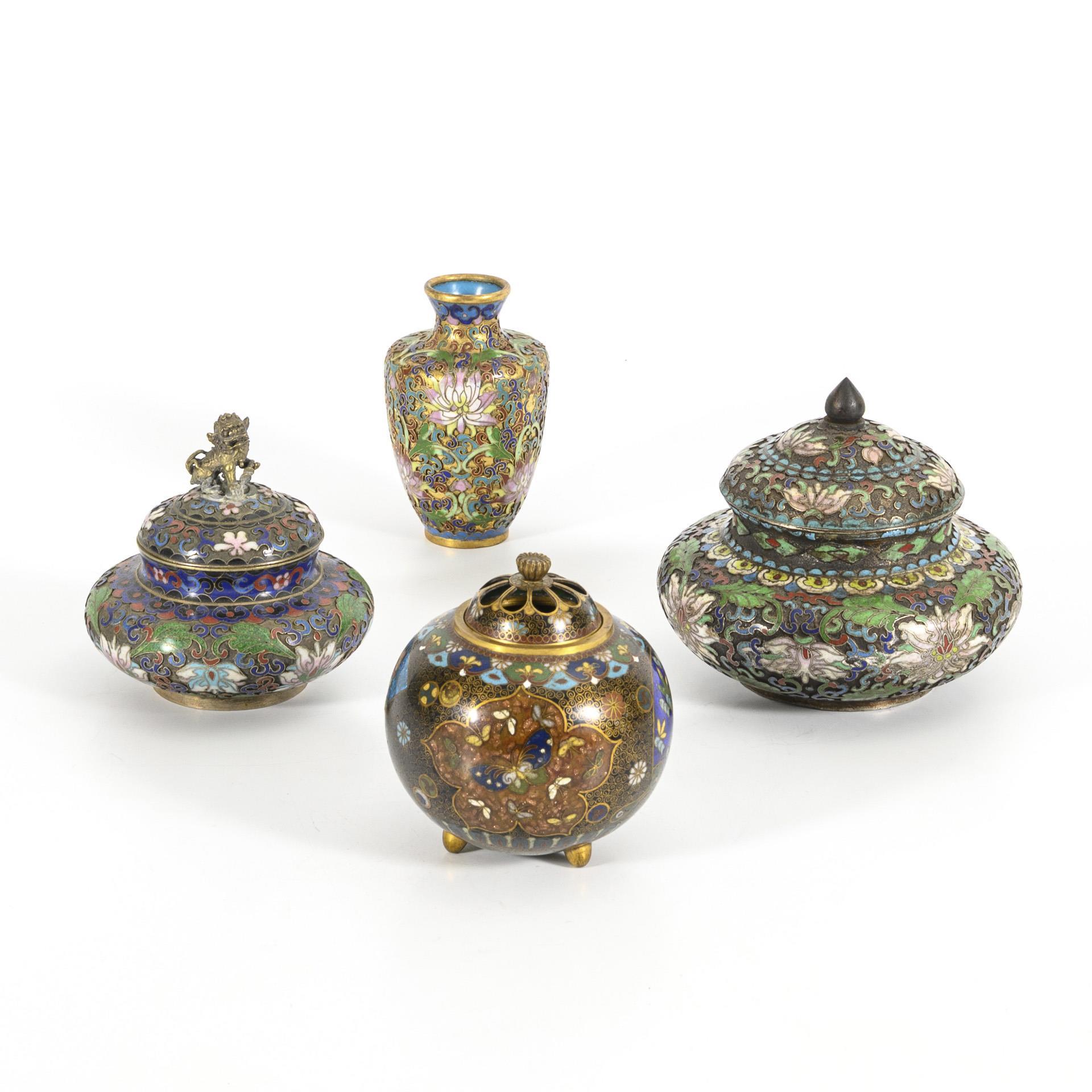 Duftgefäß in sehr feiner Cloisonnétechnik, Deckel durchbrochen gearbeitet, drei kleine Kugelfüße. H 10 cm. / Größere Dose mit Knospenknauf, H 12 cm. / Kleinere Dose mit Fo-Hund-Knauf. H 10 cm. / Balustervase, H 10,5 cm, kleiner Steg steht ab.