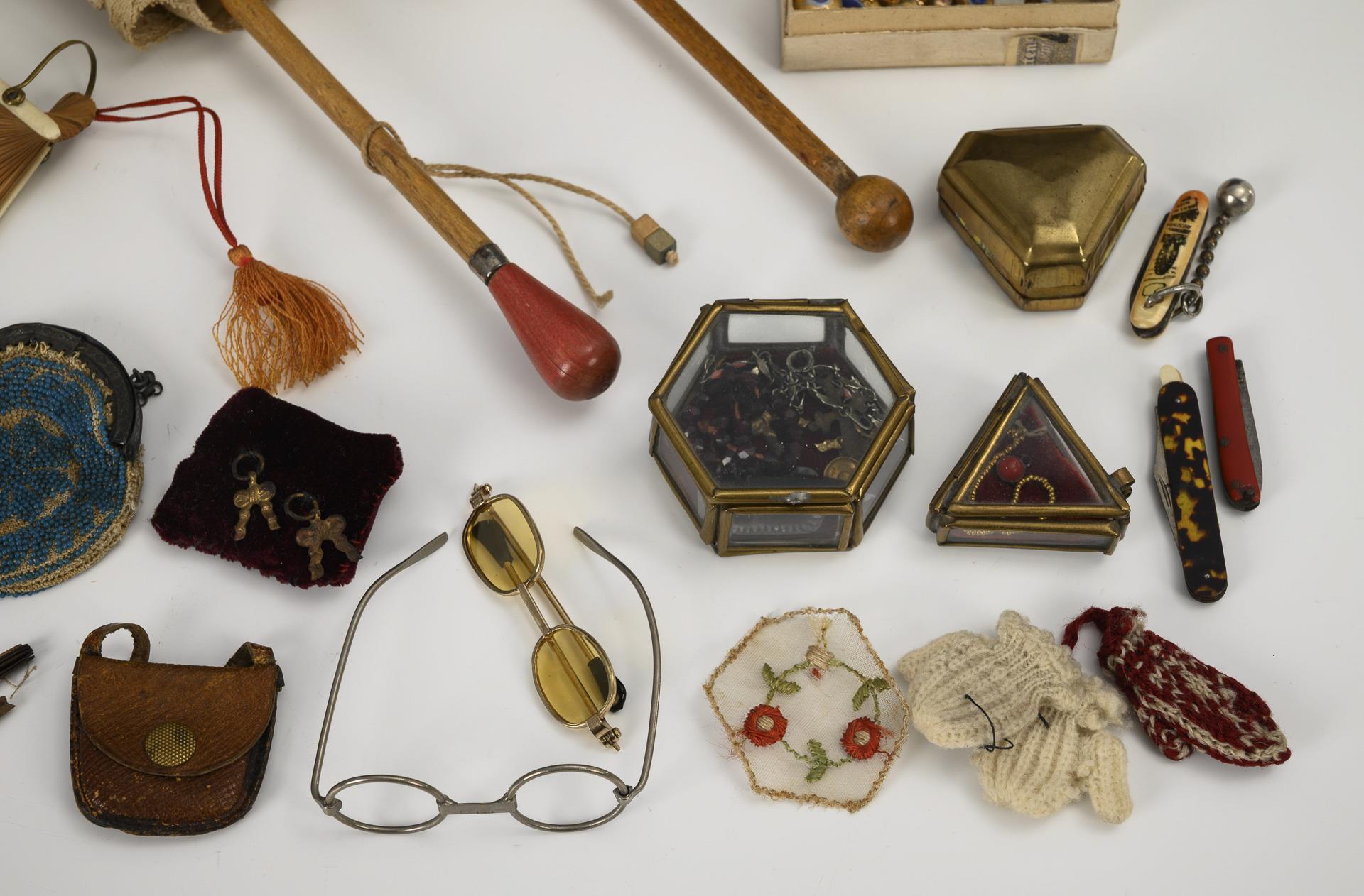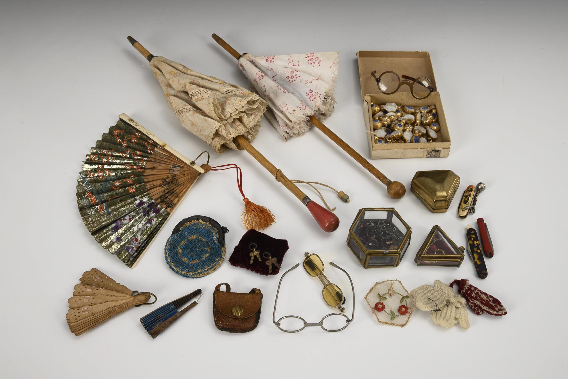 2 Sonnenschirme, 2 Fächer, 3 Brillen, kleine Perlentasche etc. Mit Altersspuren und Defekten.