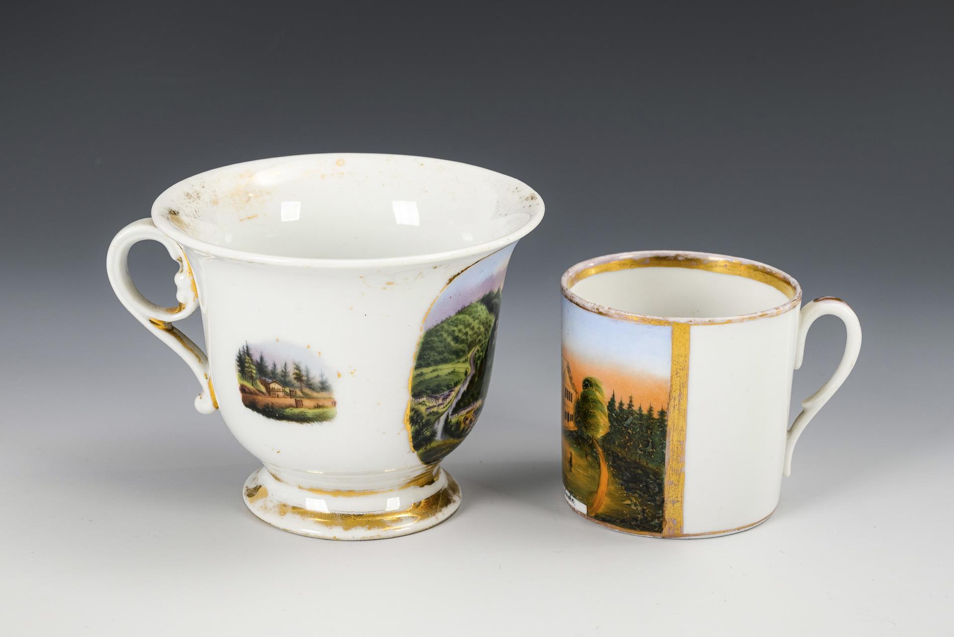 1x KRISTER: Teller mit der bezeichneten Ansicht der Schwarzburg im Spiegel (Ø 18,5 cm). / 1x Prägemarke "G": Glockentasse mit der schauseitigen Ansicht der Schwarzburg (H 8,5 cm), mit Untertasse (Ø 16 cm). / 1x GOTHA: Zylindertasse (H 6,5 cm) mit der bezeichneten Ansicht des Gasthofes Tanzbuche bei Friedrichroda, ergänzte Untertasse (Ø 13,5 cm). Gold teils berieben, unterseitige Beschleifung an 1 Untertasse.