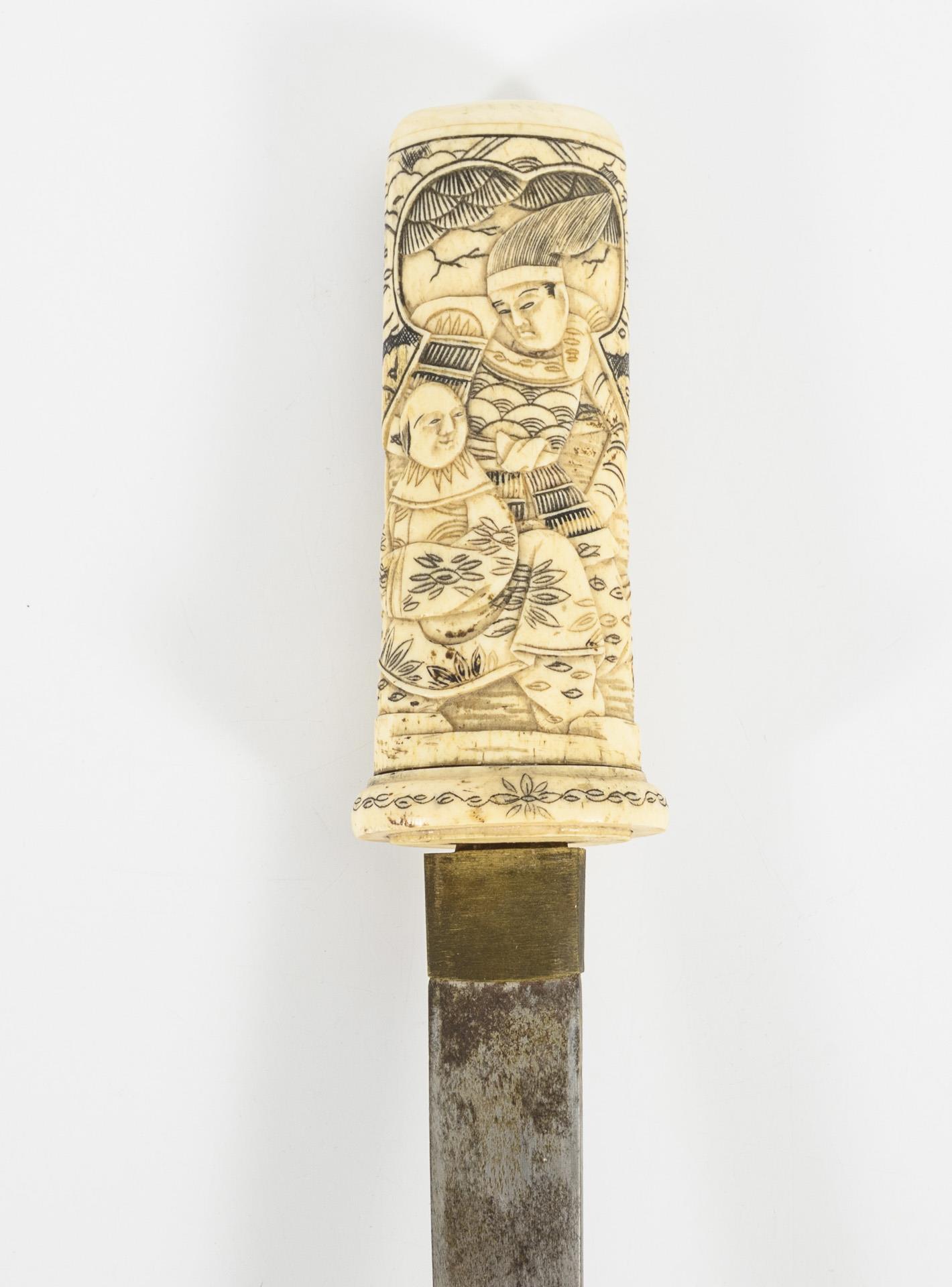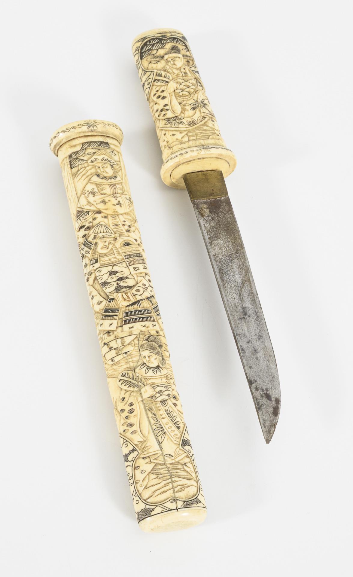 Scheide und Griff aus Bein, mit reliefierten, figürlichen Szenen, teils schwarz gemustert. Einfache, gerade Klinge mit Spitze in der Rückenlinie. Scheide hohl, mit eingefügter Holzaufnahme.