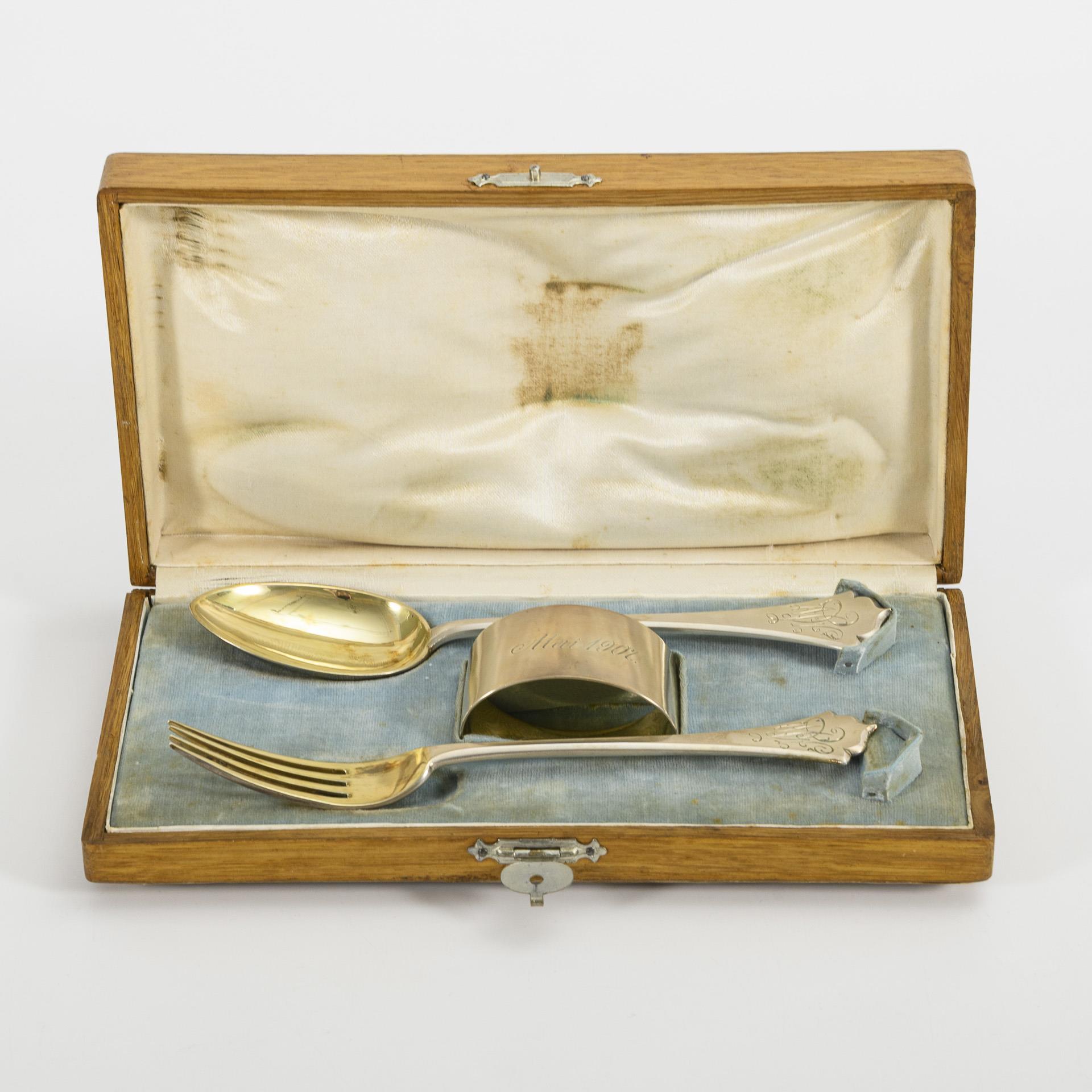Löffel, Gabel und Serviettenring, jeweils mit verschlungener Monogrammgravur "HW" und Datierung "Mai 1907", 134 g, L 5,5 - 17,5 cm.