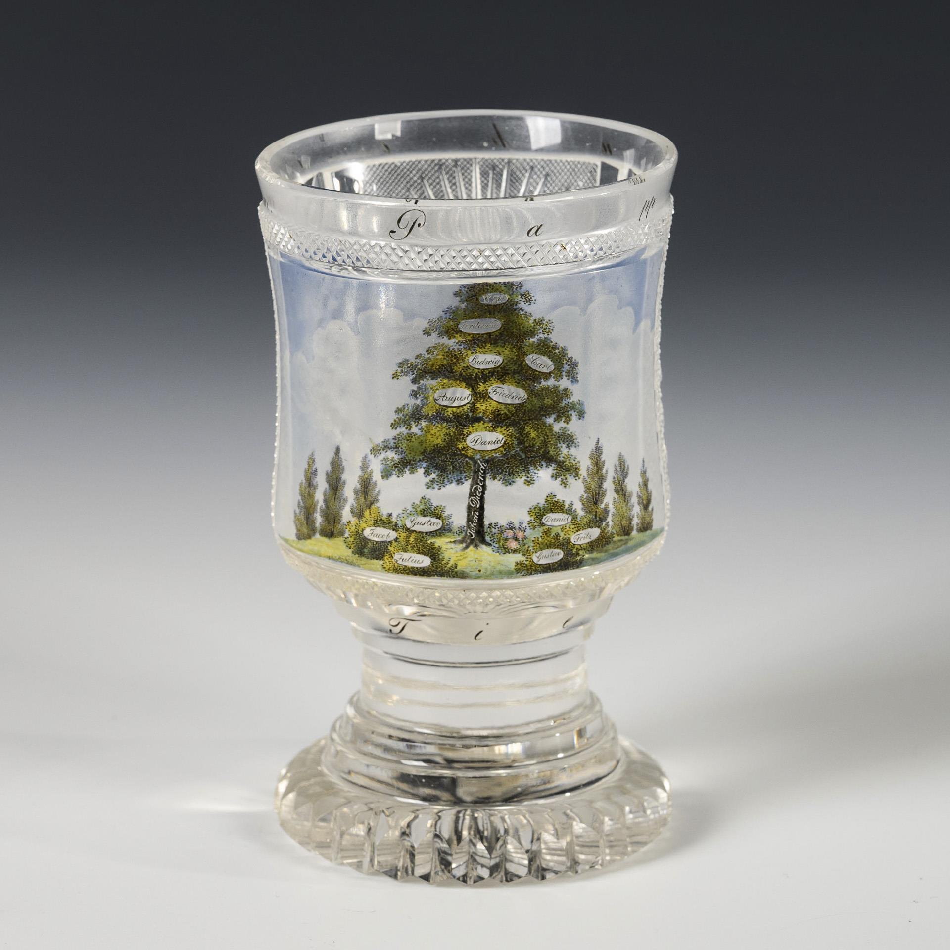 Leicht konkave Kuppa mit Steinel- und Linsenschliff, kurzer, profilierter Schaft, Rundfuß mit Bodenstern. Schauseitig eine Rechteckkartusche mit der Darstellunge eines in einer Landschaft stehenden Baumes mit Namenstafeln, unterhalb des Mündungsrandes sowie am Kuppaansatz die Familiennamen "Pappenheim" bzw. "Tiefenbach".