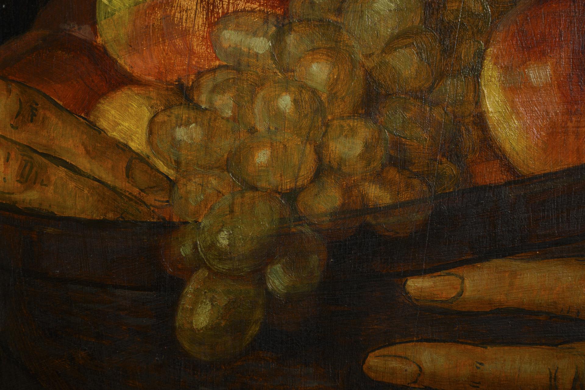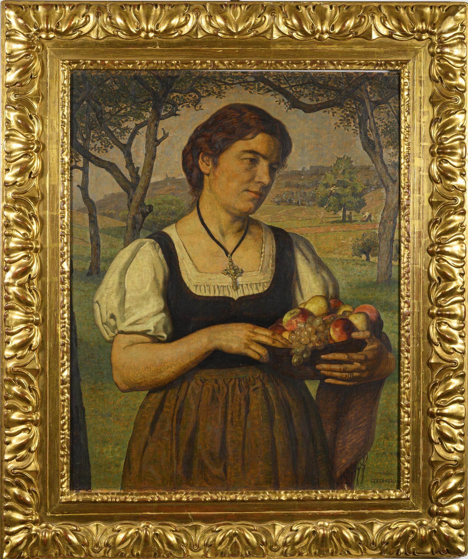 Porträt einer jungen Frau in ländlicher Kleidung zwischen Obstbäumen mit einer Schale voll Äpfel und Trauben. Altersspuren.