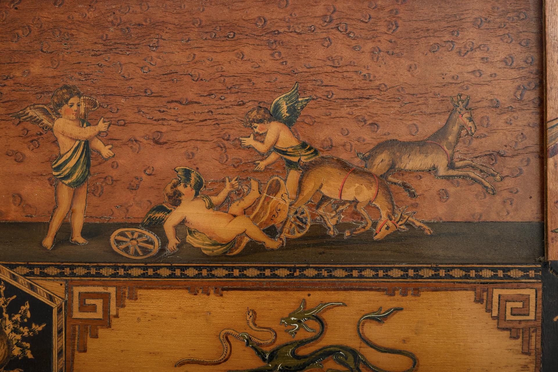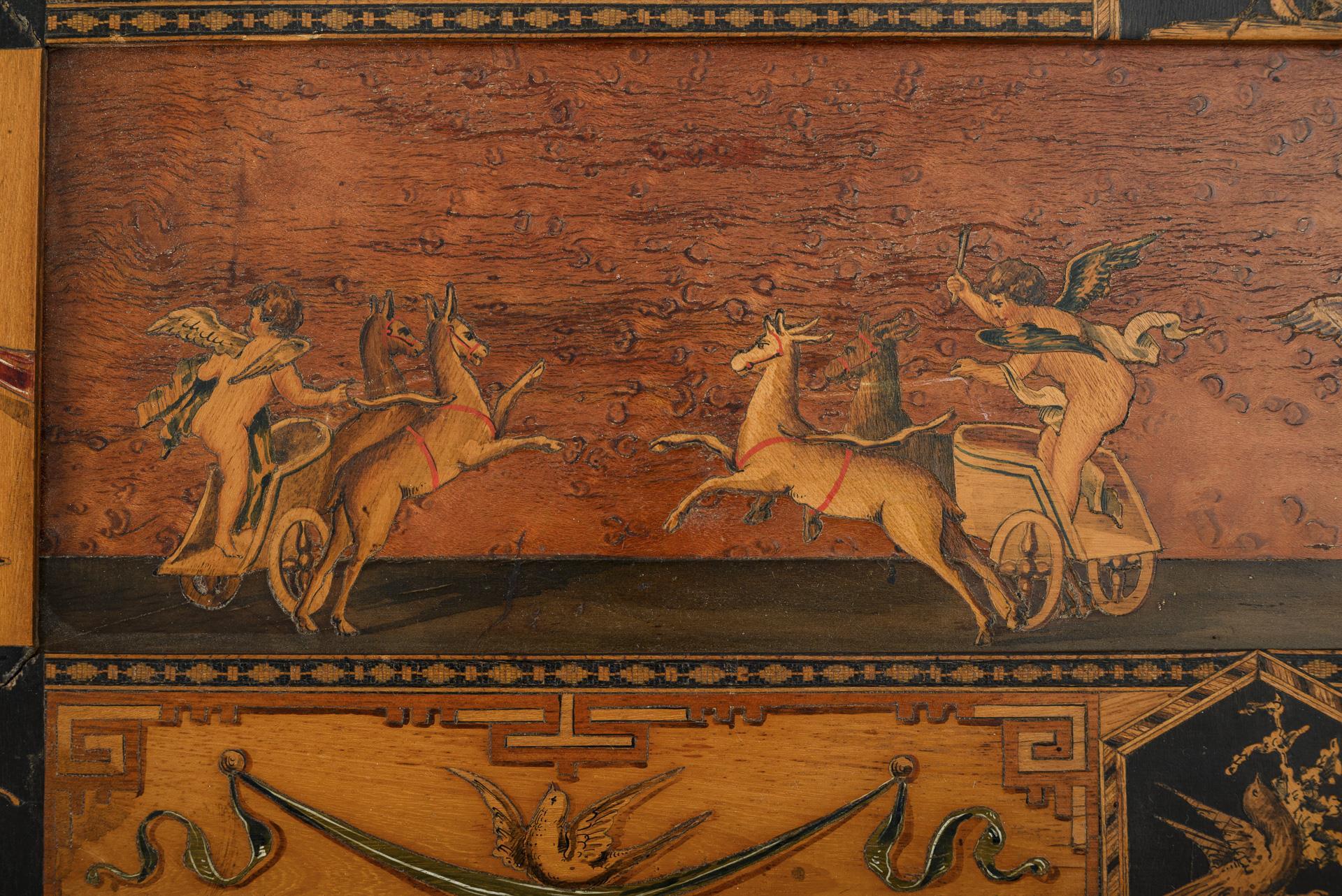 "Intarsienbild" nach dem antiken Fries in der Casa dei Vettii in Pompeji, bei dem die puttenartigen Eroten in verschiedenen Situationen des Rennens dargestellt sind. Gleichartig gearbeiteter Originalrahmen mit Fabelwesen, Putto und Vogel sowie Ornament. Wenige Alters-/Gebrauchsspuren.