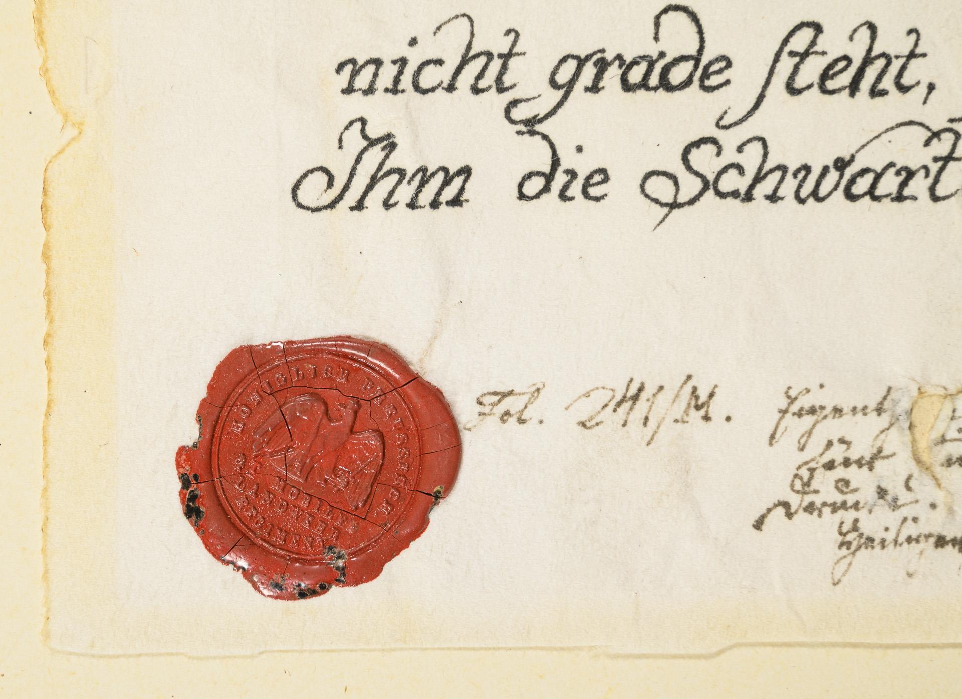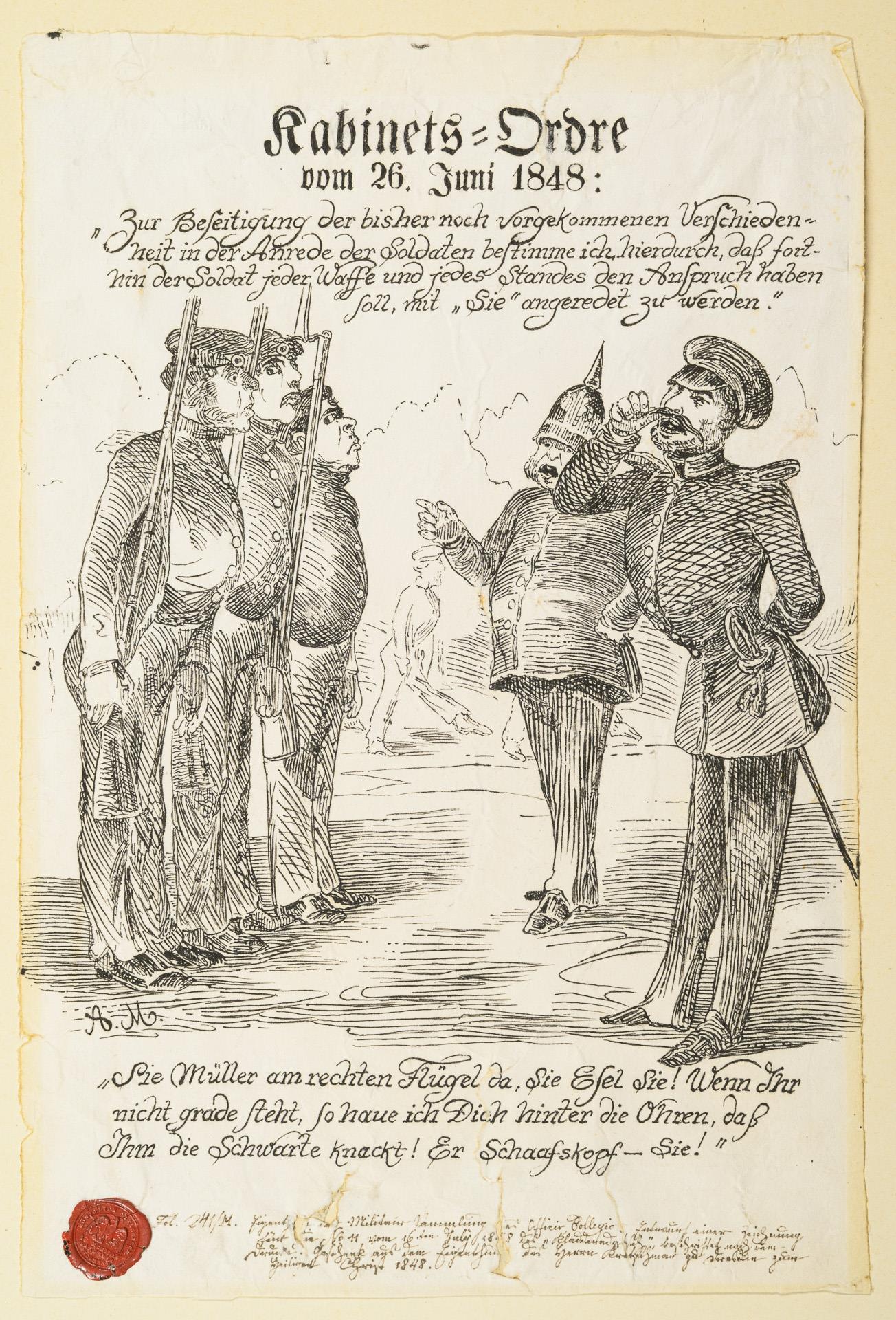 Kopie oder Vorlage für die Karikatur im Kladderadatsch. Unter dem Blatt Siegel: "Königlich Preußisch 4t Mobiles Landwehr Regiment", dazu handschriftlich: "Fol. 241/M Eigenth() Militair-Sammlung des Officier Collegio Entwurf einer Zeichnung für die No 11 vom 16ten July 18?8 des 'Kladderadatsch' beschriftet nach dem ... Geschenk aus dem Eigenthum des Herrn Kretschmar zu Dresden zum Heiligen Christ 1848". Ehemals starke Knicke etwas geglättet, teils eingerissen und hinterklebt, kleinere Fehlstellen in der Handschrift, Rand gebräunt.