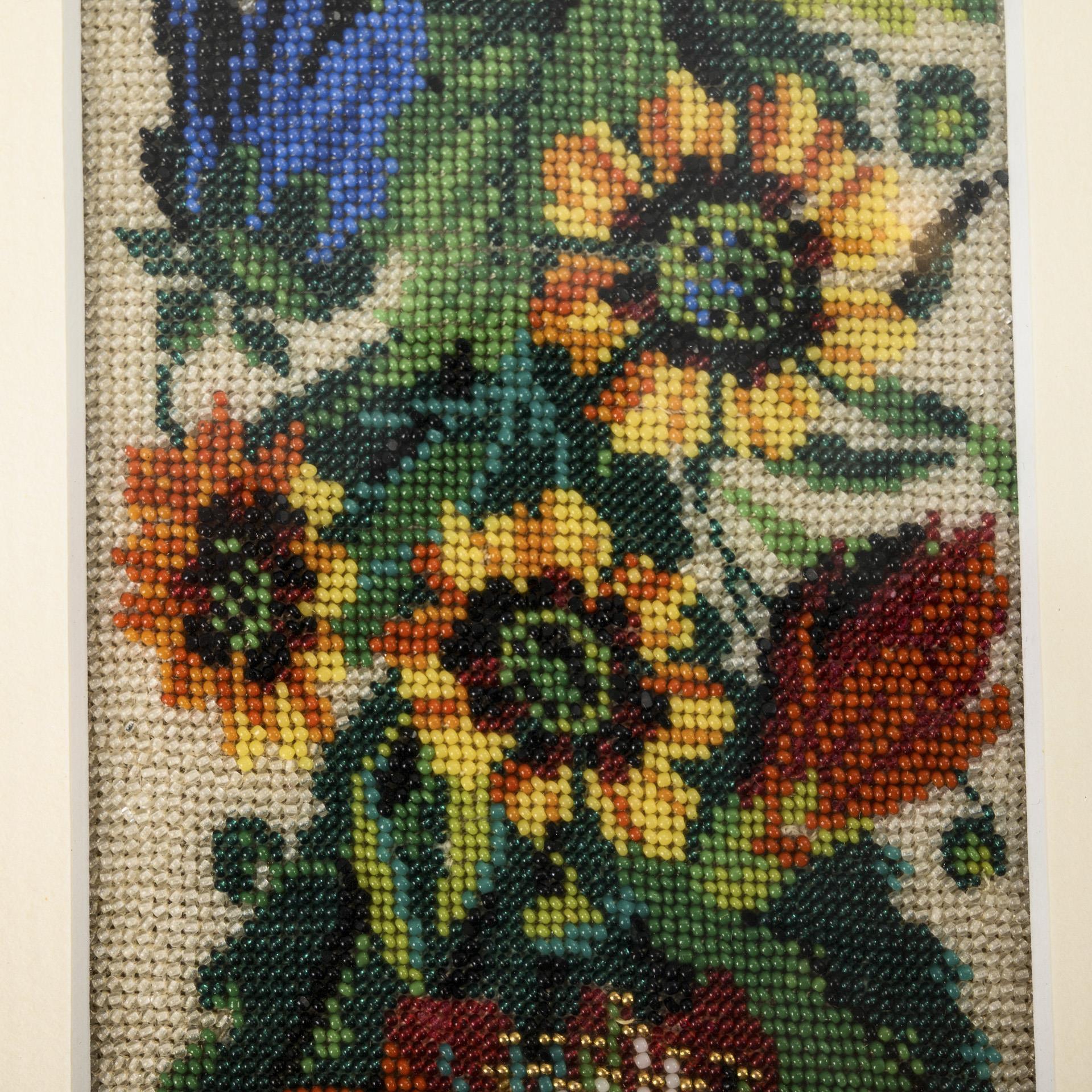 Mit sehr feinen Glasperlen ähnlich der Nadelmalerei gestickter Fries verschiedenster Blumen in kräftigen Farben. Im verglasten Passepartout mit Goldleiste.
