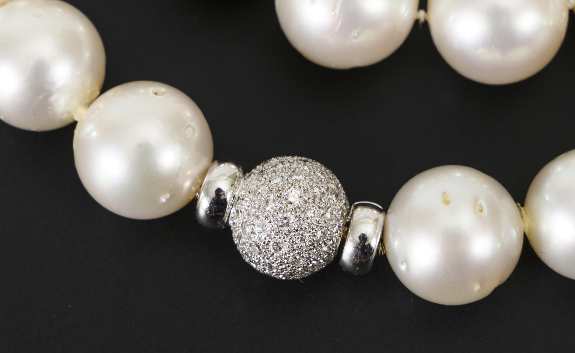 Schließe Weißgold 750 geprüft. Durchmesser der Perlen je ca. 1,31 bis 1,63 cm, Kettenlänge 48,5 cm. 134,5 g.