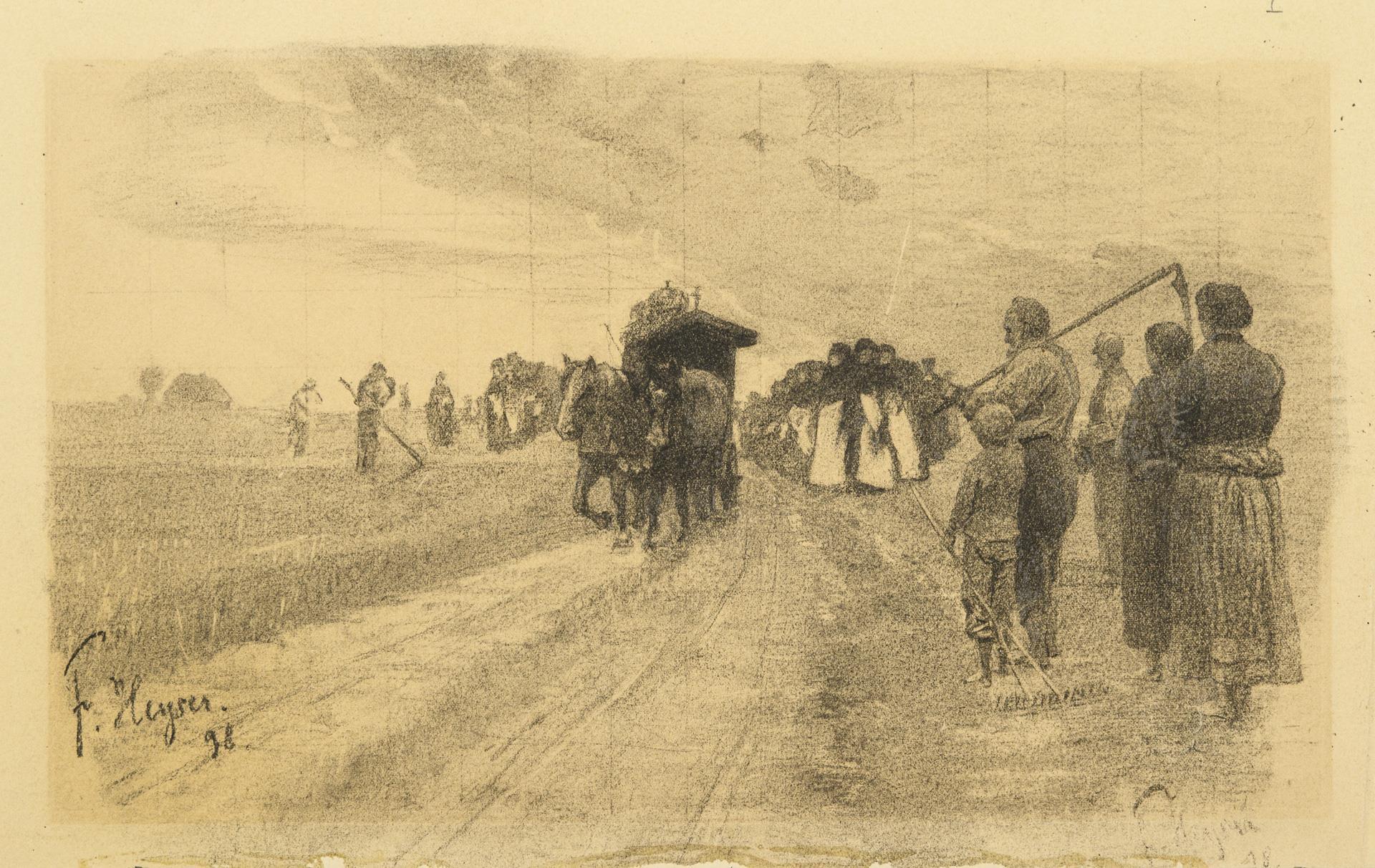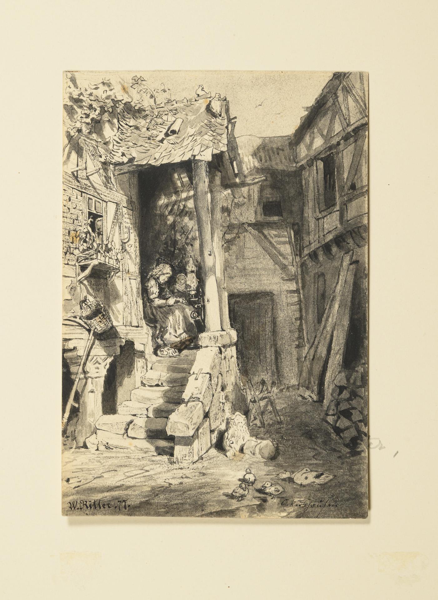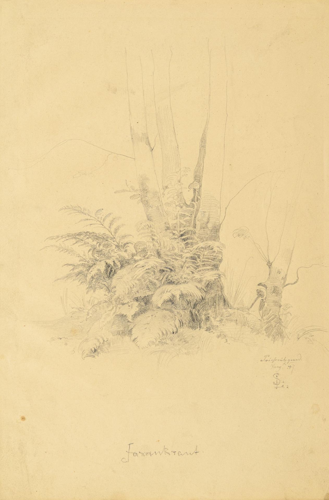 Alfred Wagner: "Schloß Schönfeld bei Pillnitz", Aquarellzeichnung, monogrammiert, datiert (18)98. / Karl Traugott Faber (1788 - 1863), 3 Schafstudien, Bleistiftzeichnung, eine signiert. / Louis Saupe (Mitte 19. Jahrhundert): Farnstück im "Priesnitzgrund", Bleistiftzeichnung, monogrammiert. / Friedrich Wilhelm Theodor Heyser (1857 - 1921): Trauerzug während der Ernte, Kohlezeichnung, Handsignatur, (18)98. Eventuell Vorzeichnung zu einem Gemälde. / Wilhelm Georg Ritter (geboren 1850): Spinnende Alte auf einem Treppenabsatz. Tuschzeichnung, Handsignatur (18)77? / Alle Blätter im Passepartout.