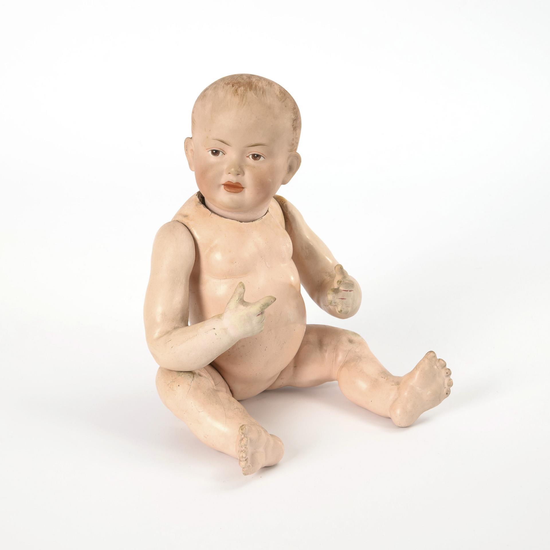 Unbekleidetes Vollkopfbaby mit Kurbelkopf, gemalten braunen Augen und 5-teiligem Sitzbabykörper. Haarbemalung und Körper teils berieben.