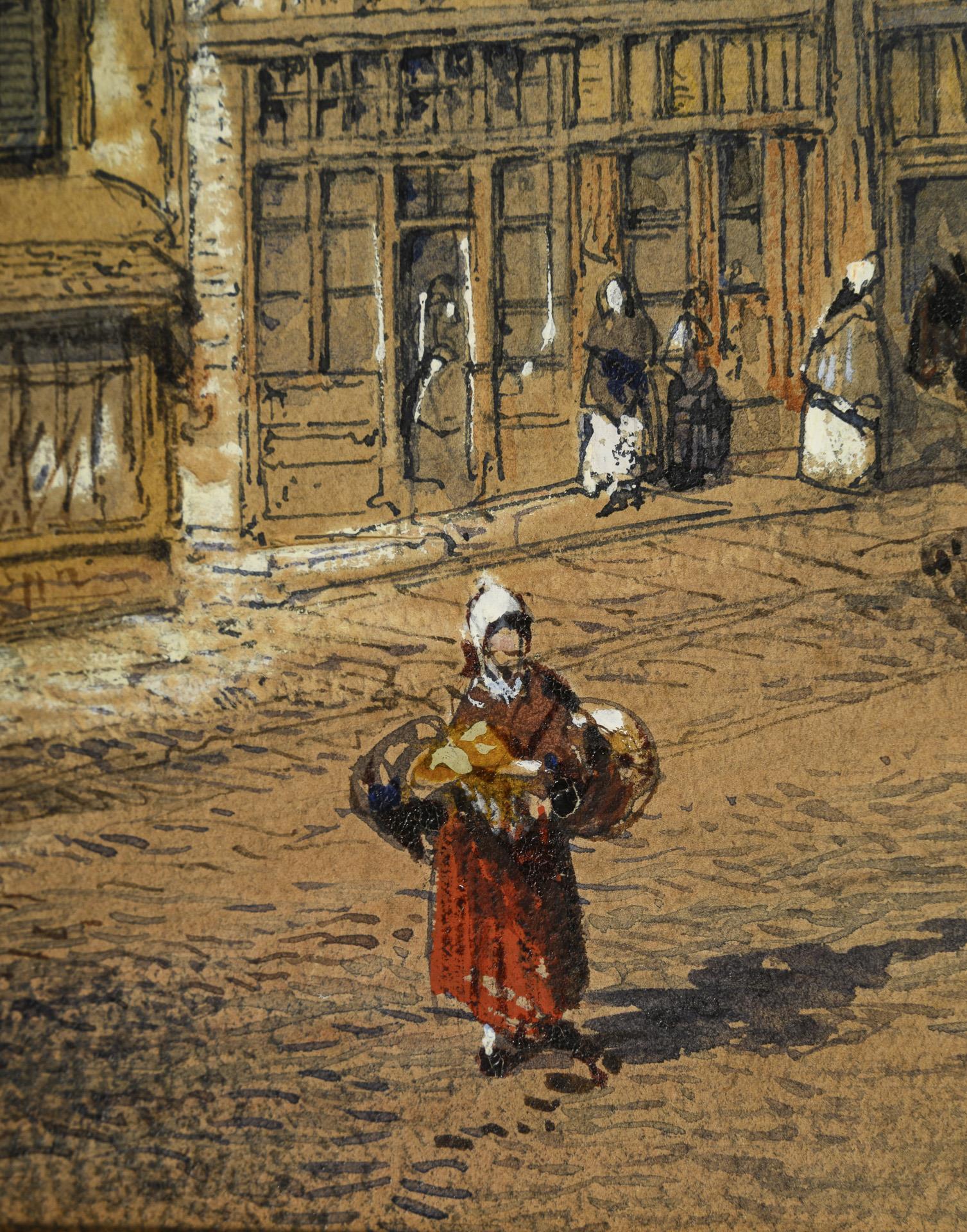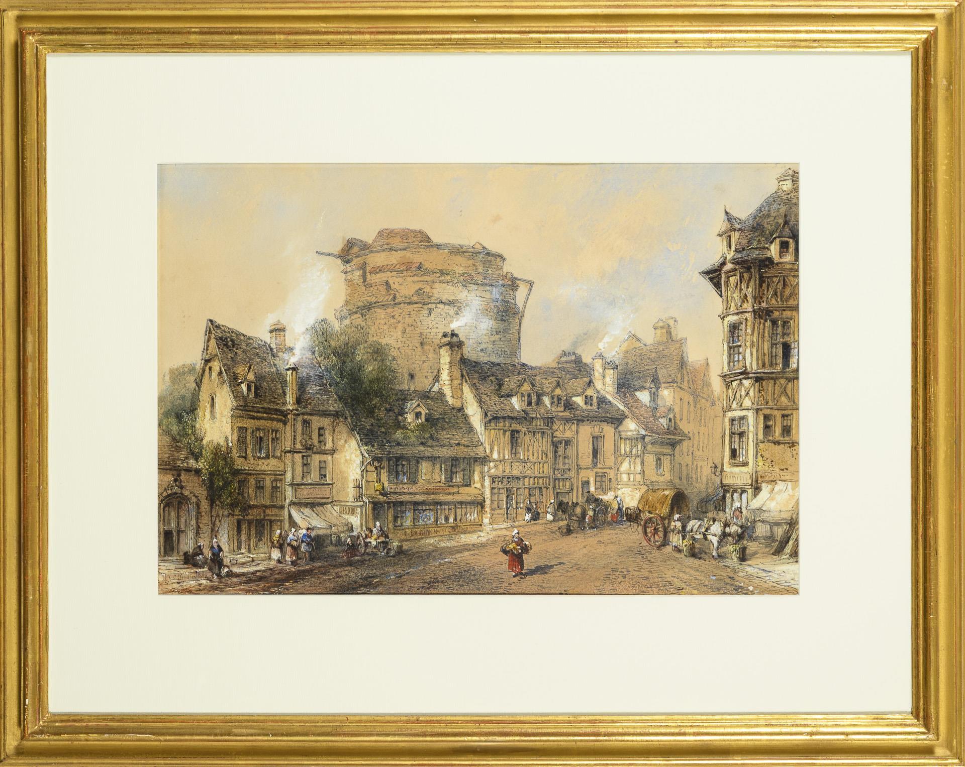 Blick in eine französische Stadt mit zahlreichen Personen auf der Straße vor den Fachwerkhäusern und dem Turm dahinter.
