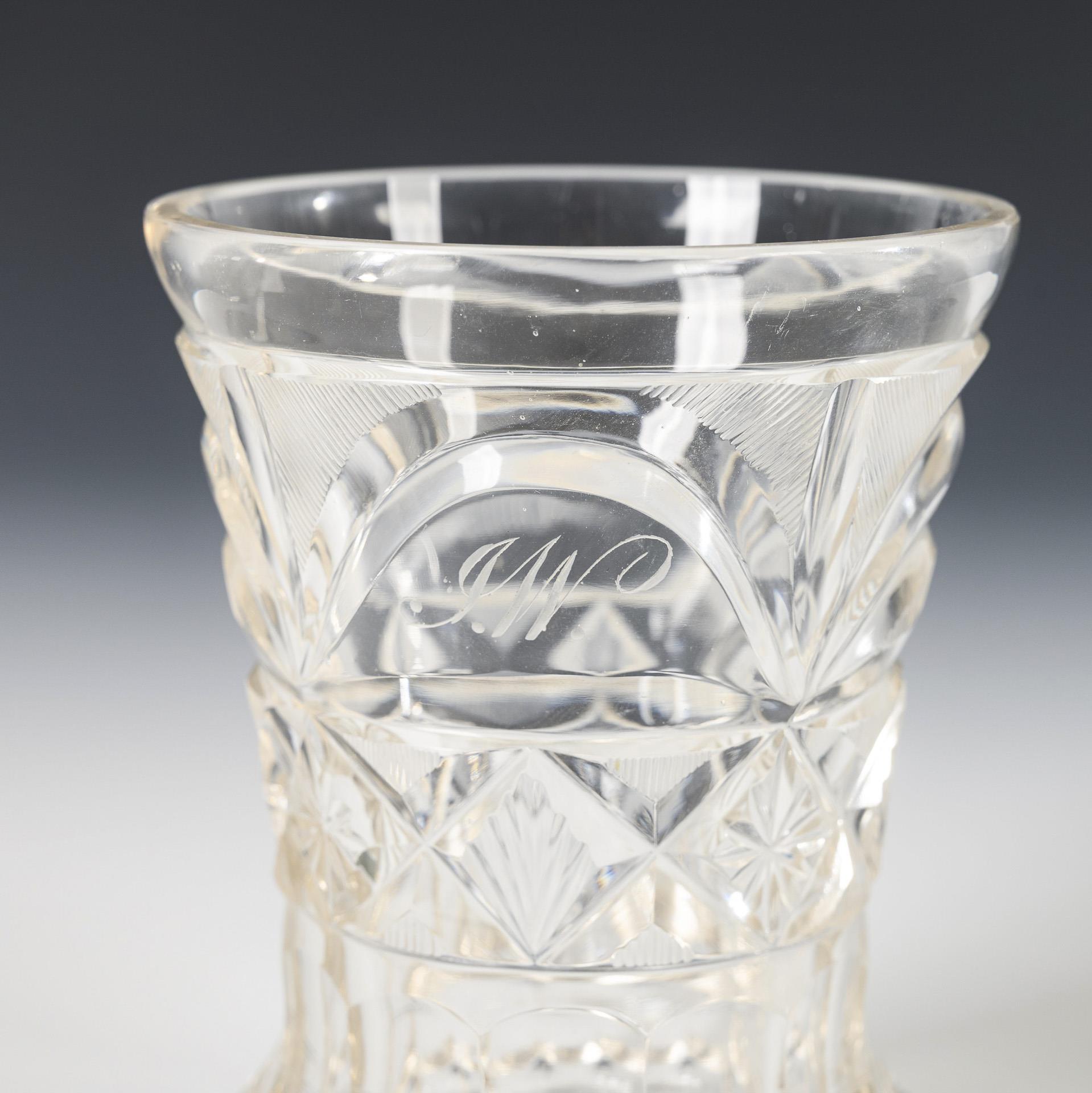 Ranftbecher mit reichem Facetten-, Kerb- und Steinelschliffdekor. Auf der Wandung das gravierte Monogramm "J.W.", auf dem Boden die Bezeichnung "Landeck im August 1833".