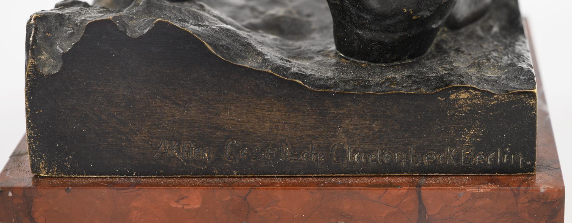 Bronze schwarz patiniert, rote Marmor-Plinthe. Bezeichnet, Gießermarke "Aktien Gesellsch. Gladenbeck Berlin.". H 37 / 39 cm. 3,8 kg.