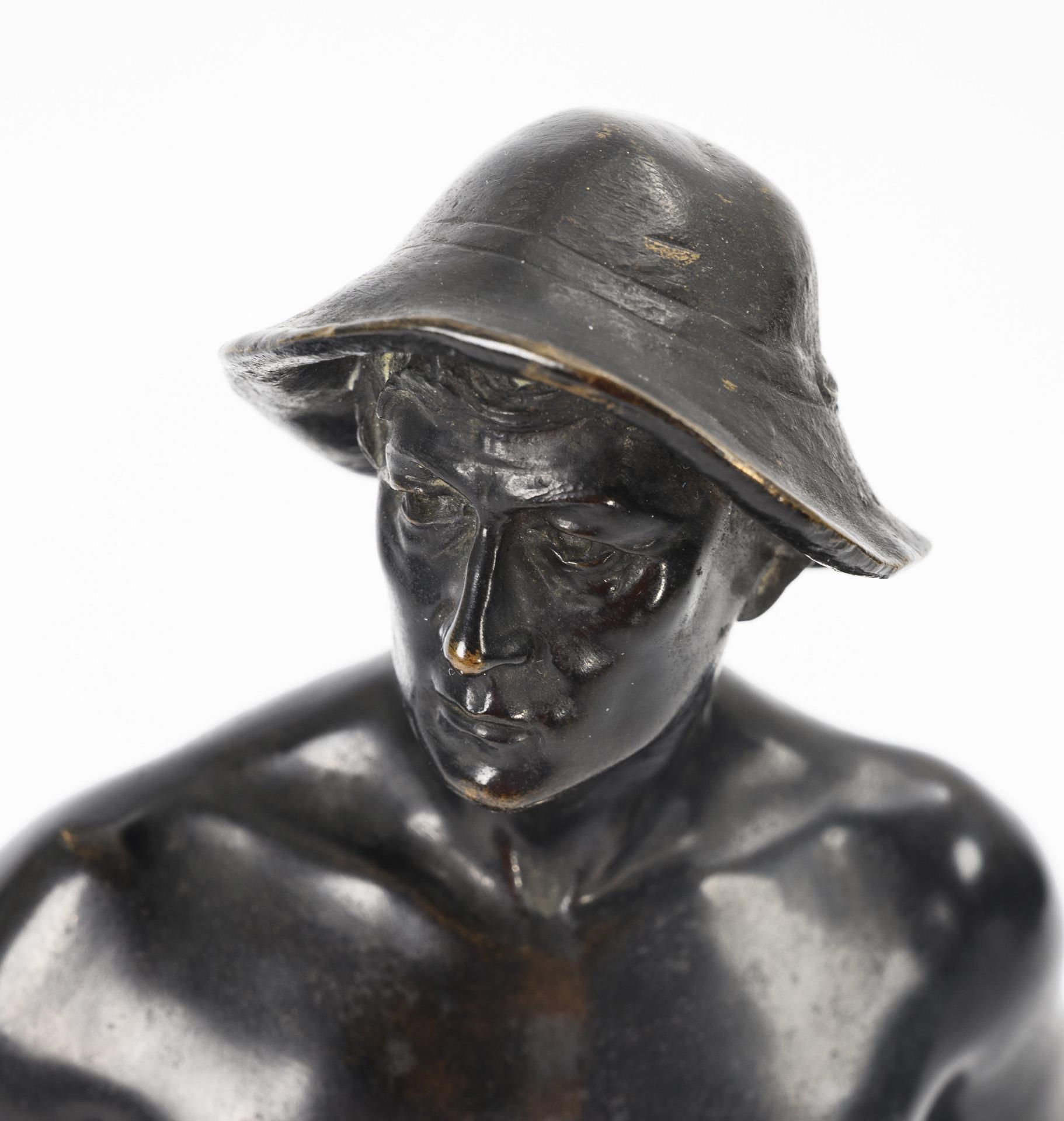 Selbstbewusst stehender junger Arbeiter mit Hut und freiem Oberkörper sowie Geleucht am Gürtel, der in die Ferne blickend sich auf die Hacke stützt. Patina minimal berieben.