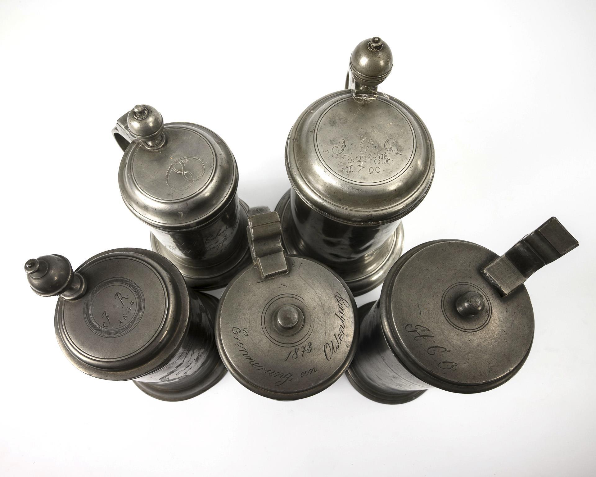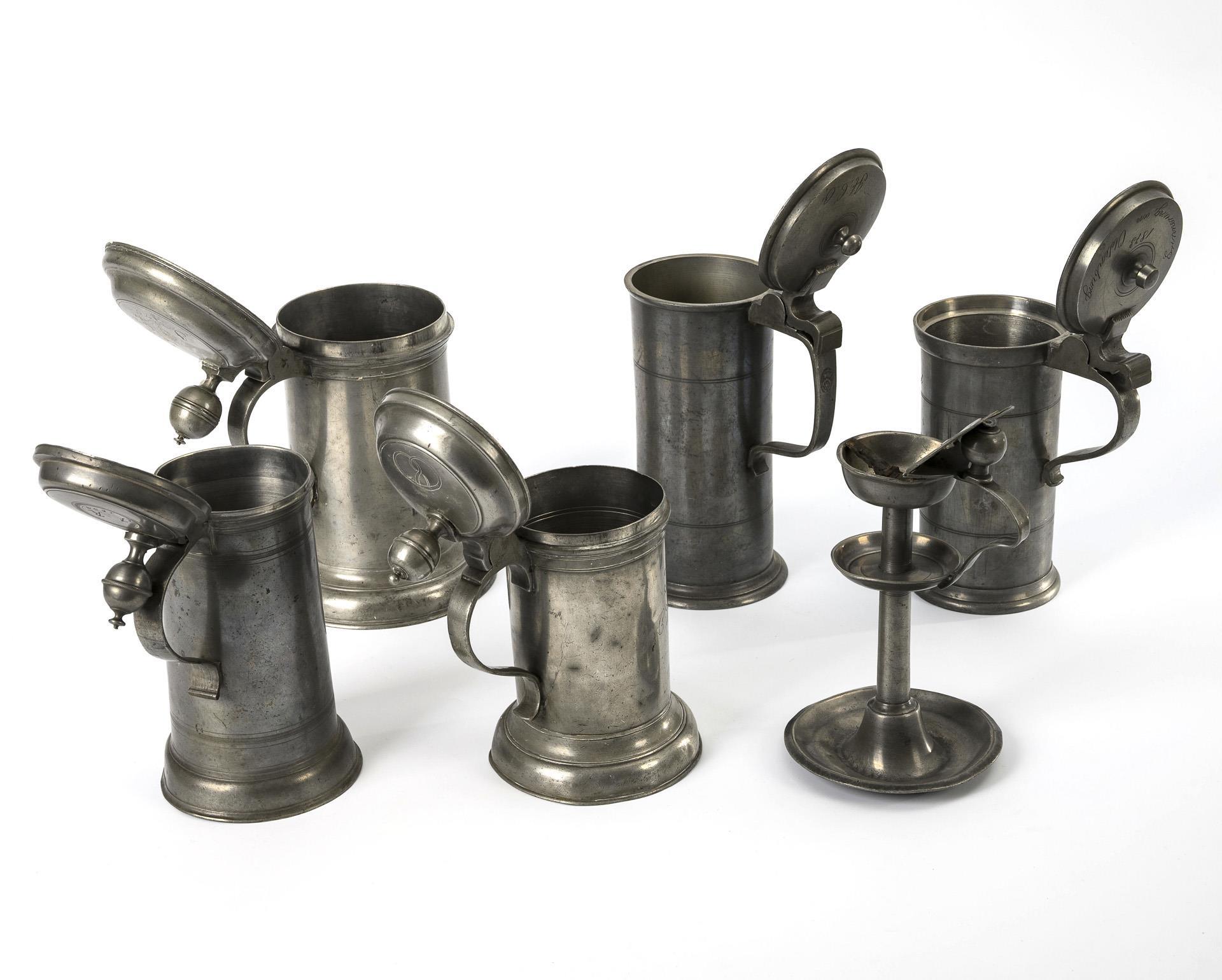 5 Walzenkrüge: Heller Walzenkrug von David Heinrich Teichmann, Pößneck mit graviertem Monogramm und Datum "1790". / Kleinerer heller Zunftkrug der Bäcker von Friedrich Enke, Pößneck mit gravierter Brezel auf dem Deckel und Meisternamen auf der Wandung mit Datum 1836. / Im Deckel undeutlich gemarkter Krug mit Monogramm und Datum 1834 auf dem Deckel; auf der Wandung Sinnspruch. / 2 ähnliche schlanke Krüge, unterschiedlich an den Henkeln gepunzt. 1x mit Monogrammgravur, 1x "Erinnerung an Oldenburg 1873", auf der Wandung Name "Wilhelm Wedekind" mit Ausflugsorten und -daten. / Ungemarkte Ölfunzel mit Scharnierdeckel. Teils starke Alters-/Gebrauchspuren.