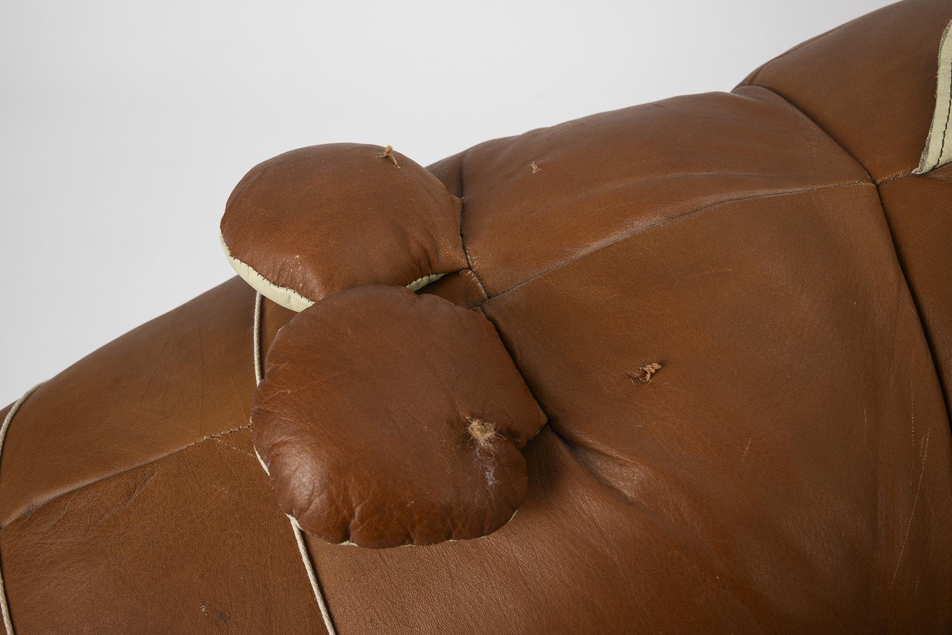 Braunes (Kunst?-)Leder, heller Stoff, weißes Leder. L 168 cm, H 31 cm, B 59 cm. 5,5 kg.
