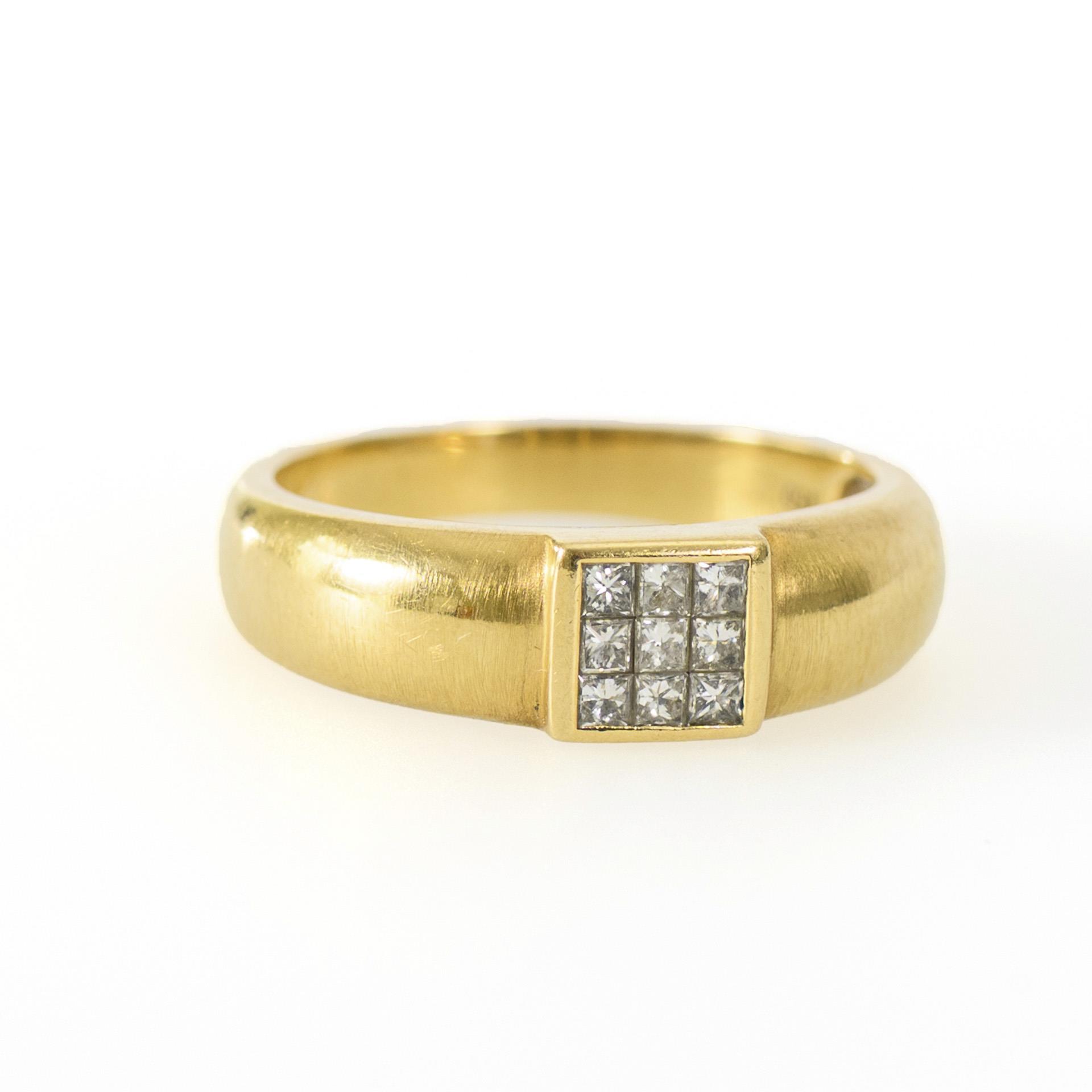 Ring mit quadratisch 3 x 3 angeordneten Diamanten in einer klassischen, abgerundeten Ringschiene. Leichte Tragespuren.