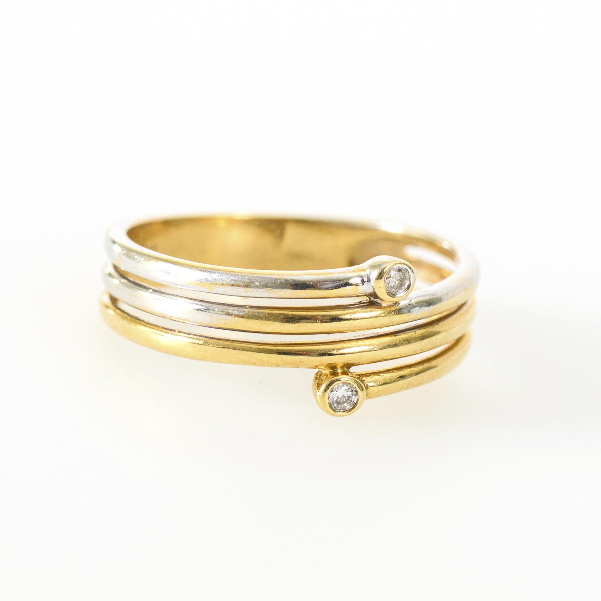 Zweifarbige Ringschiene in elegant gebänderter bzw. gewickelter Optik, besetzt mit 2 kleinen, zargengefassten Brillanten.