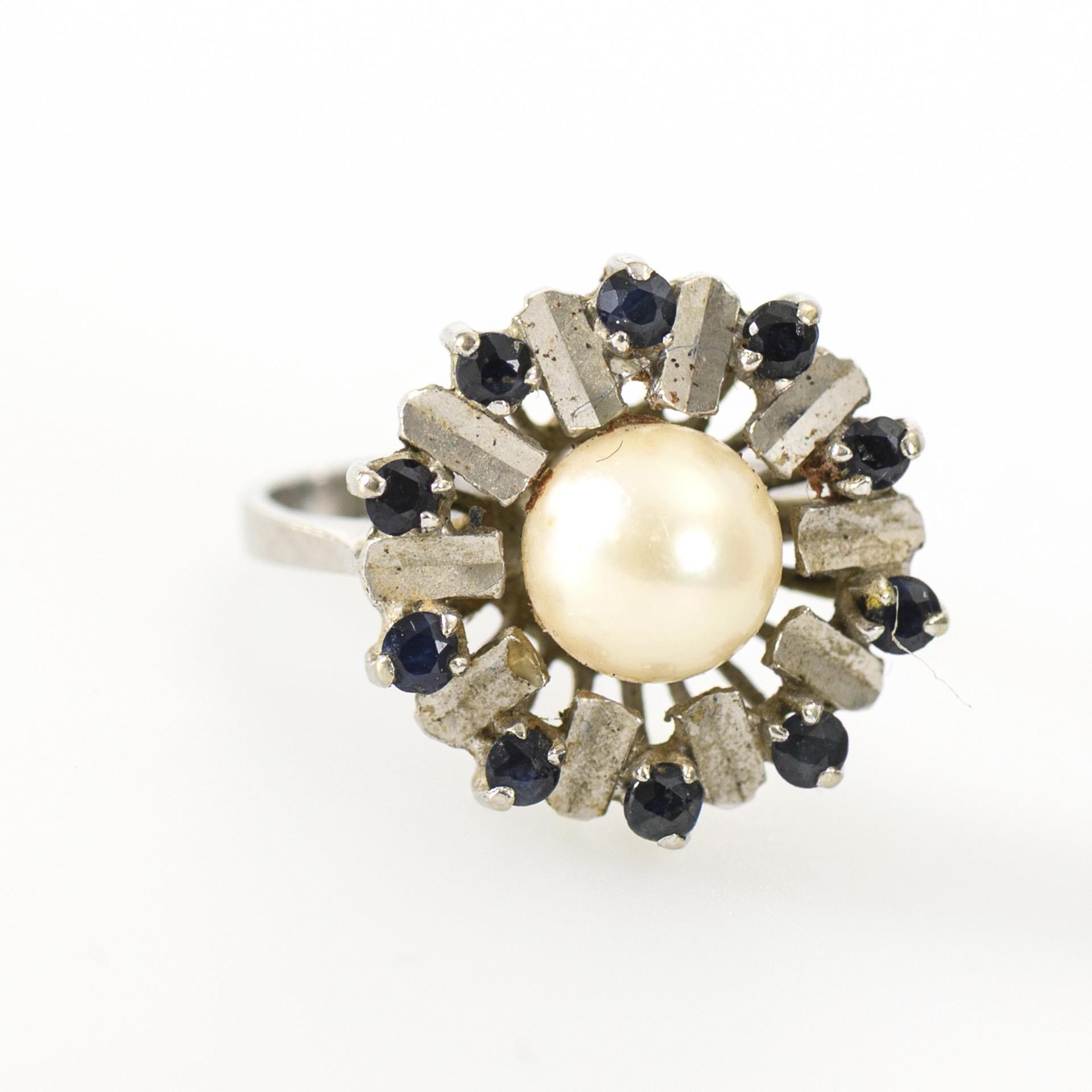 Modern gestalteter Ring mit zentraler Perle, umgeben von blütenblattartigen Weißgold-Elementen und blauen Farbsteinen, wohl Saphiren.
