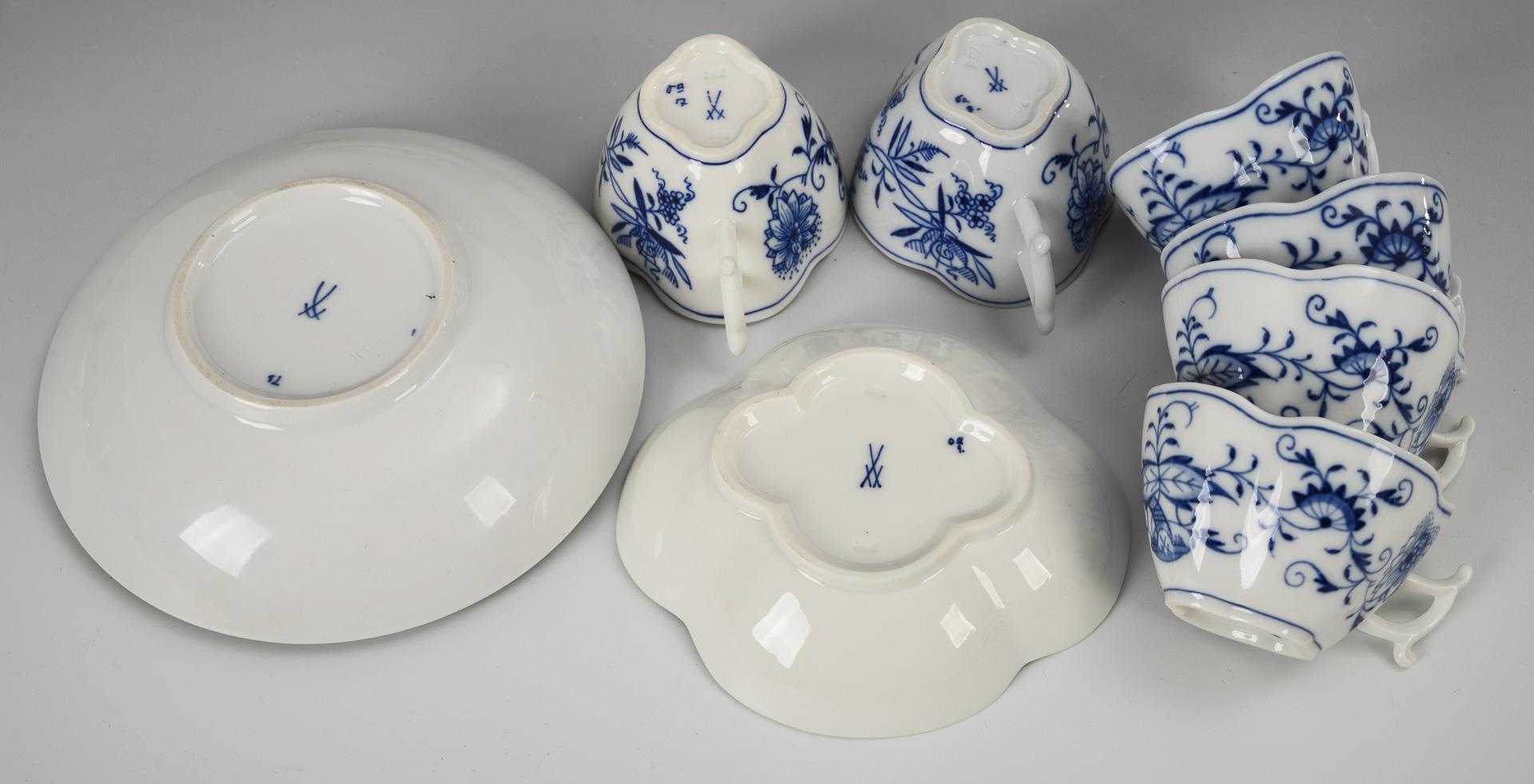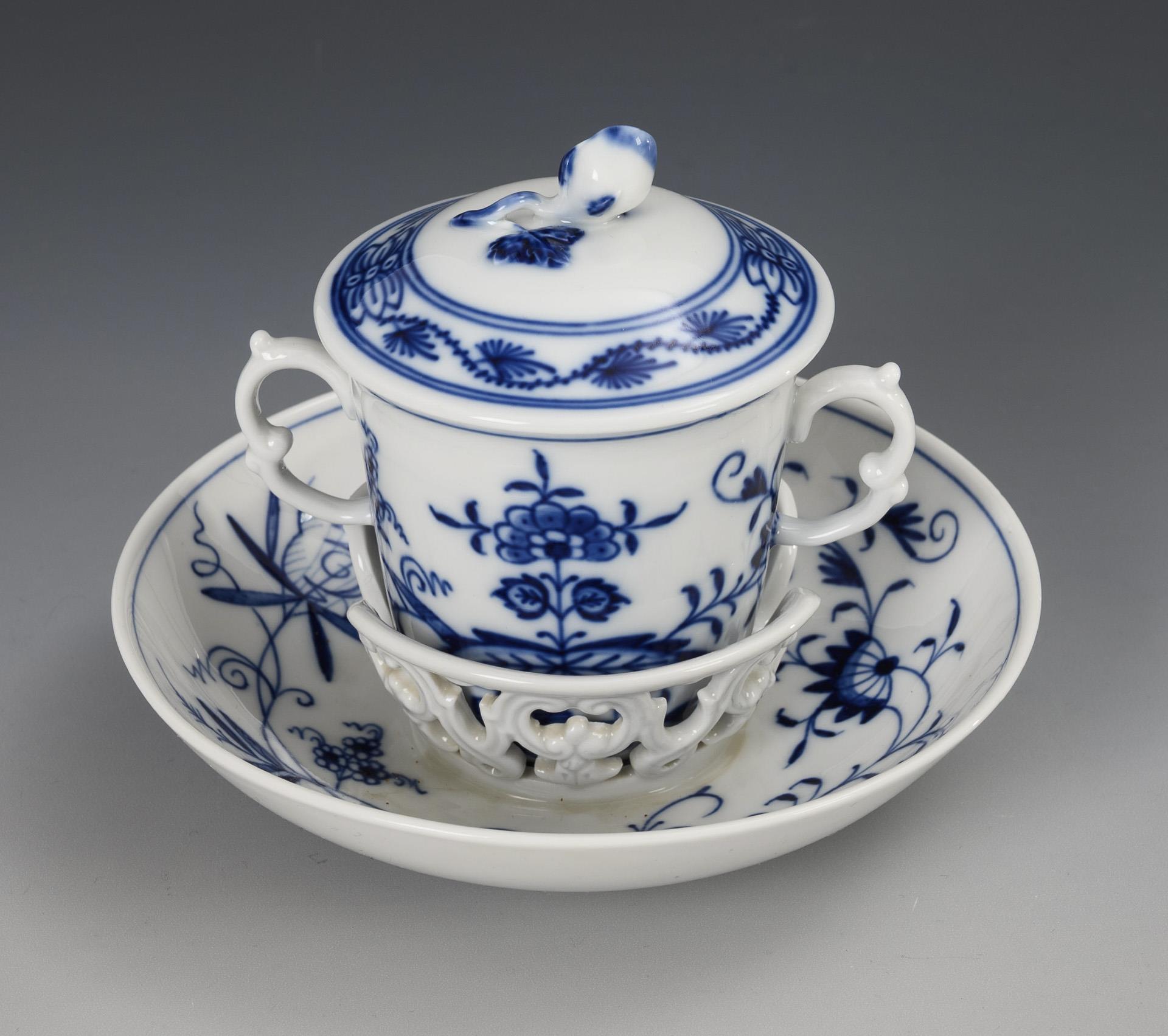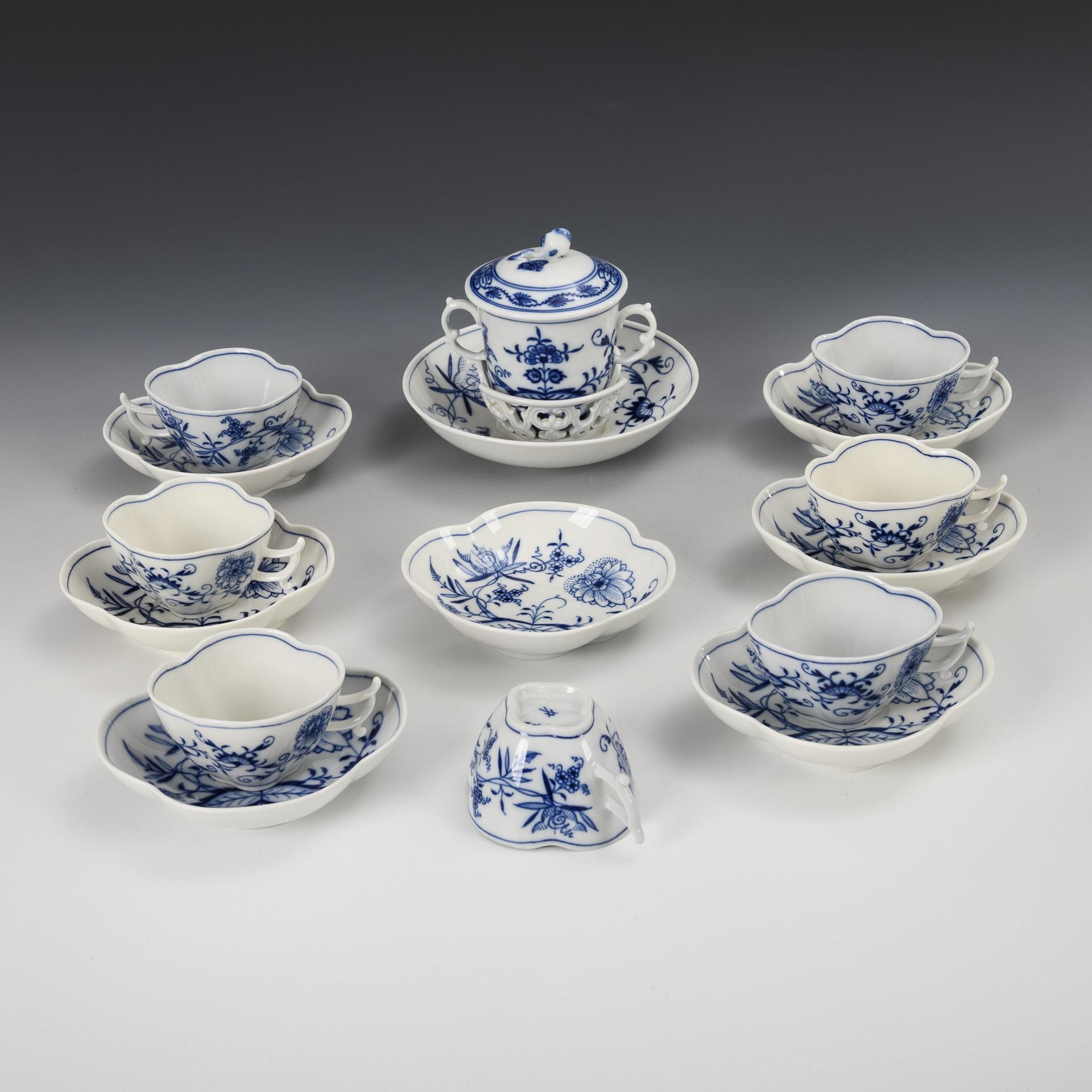 Zwiebelmuster-Trembleuse und 7 Vierpasstassen. Meissen.