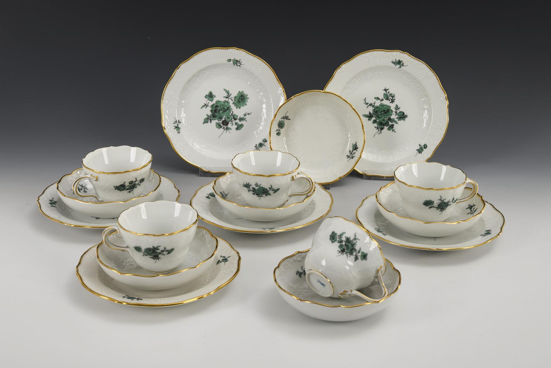 5 Gedecke + 2 Teller mit kupfergrüner Blumenmalerei. Meissen.