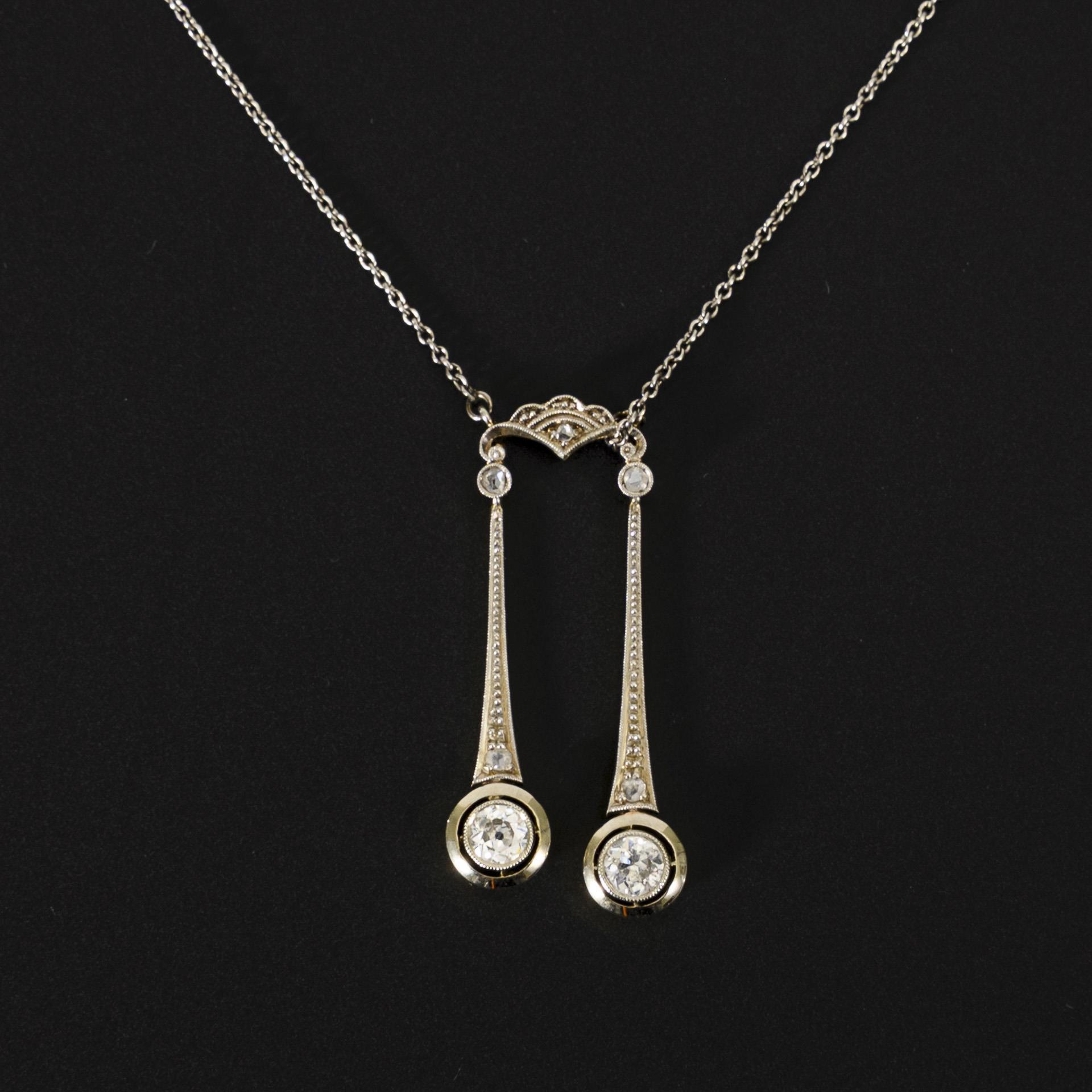 Zeittypisches Collier mit 2 Abhängungen mit je einem Altschliff-Brillant in Millegriffe-verzierter Zargenfassung sowie weiteren kleineren Diamanten.
