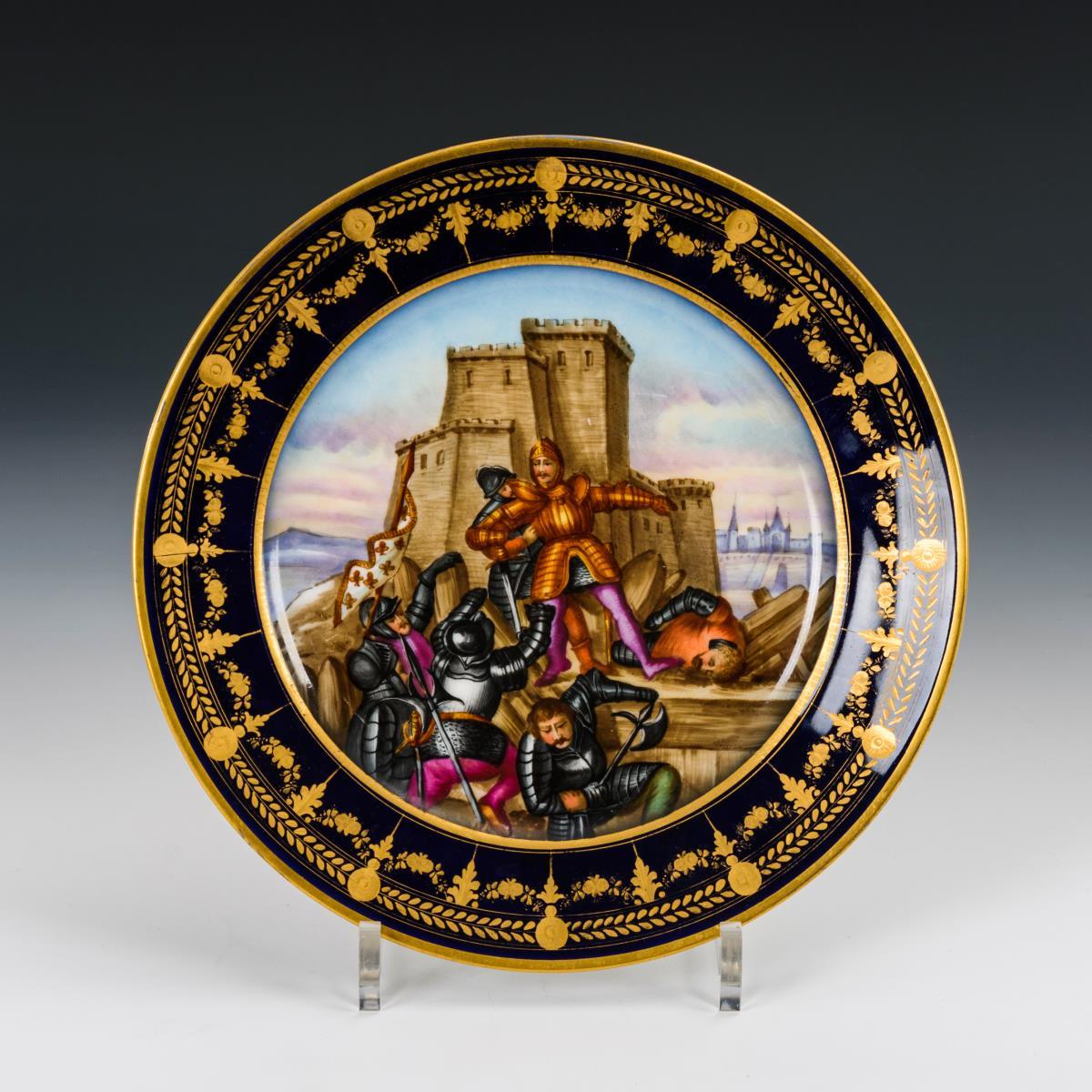 Teller mit floraler, radierter Goldmalerei auf der kobaltblauen Fahne, im Spiegel die Darstellung von kämpfenden Rittern vor einer Burg.