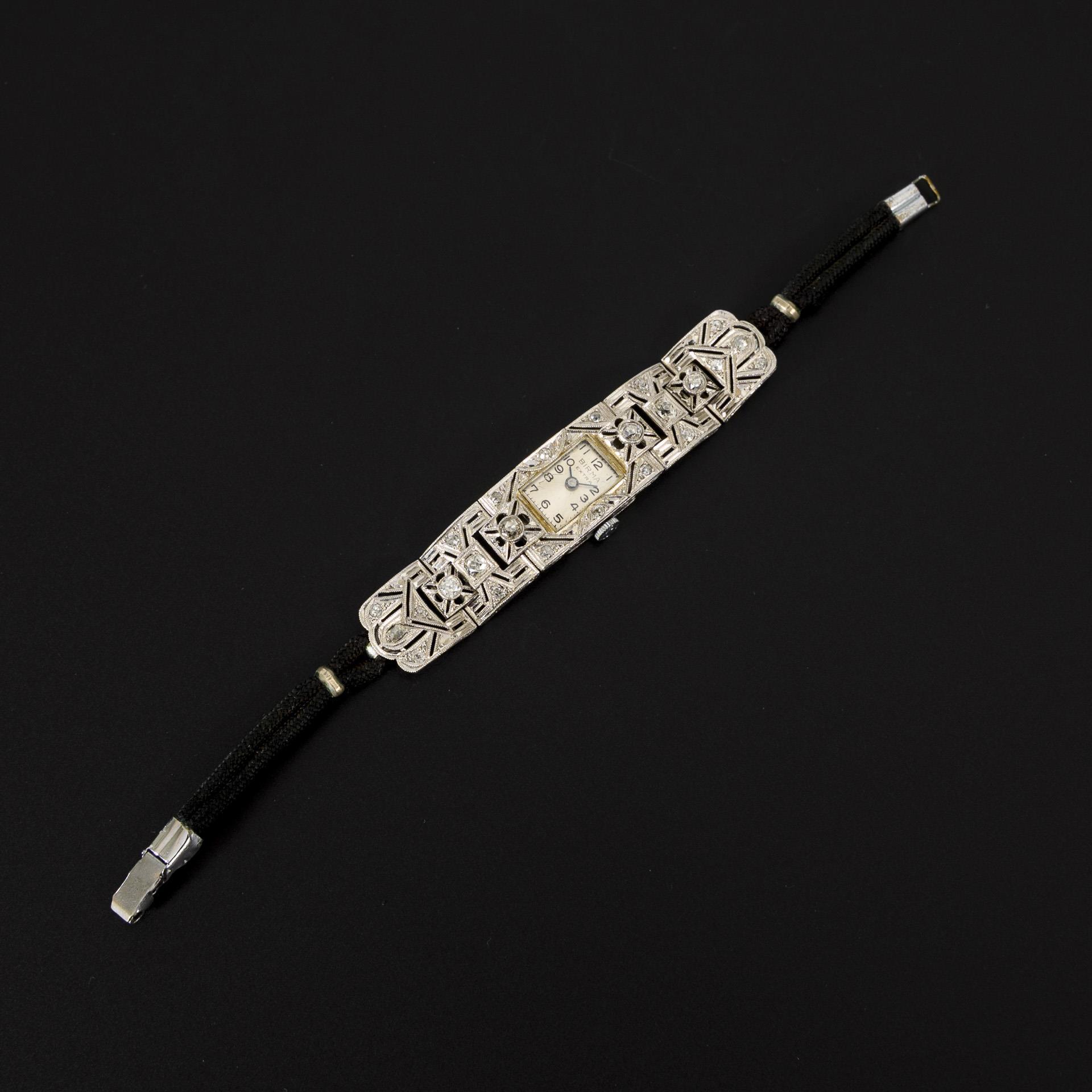 Sie befinden sich hier: Startseite Kategorien Schmuck Art déco-Damenarmbanduhr mit Altschliff-Brillanten, an Kordelband