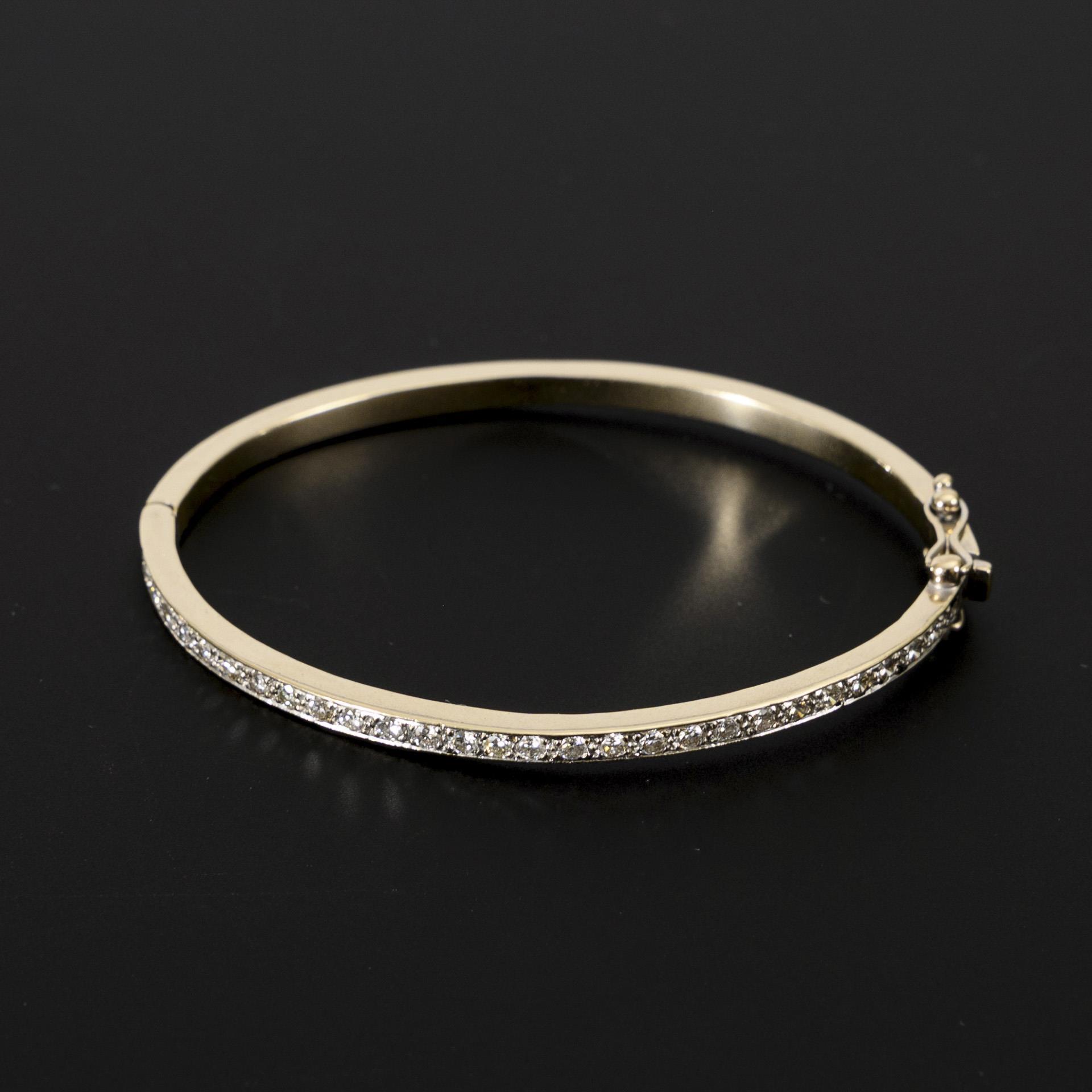 Zarter Armreif, vorderseitig mit pavégefasstem Brillantbesatz, das Schloß mit zwei Achterhaken zur Sicherung. Leichte Tragespuren, vor allem im Bereich des Schlosses.