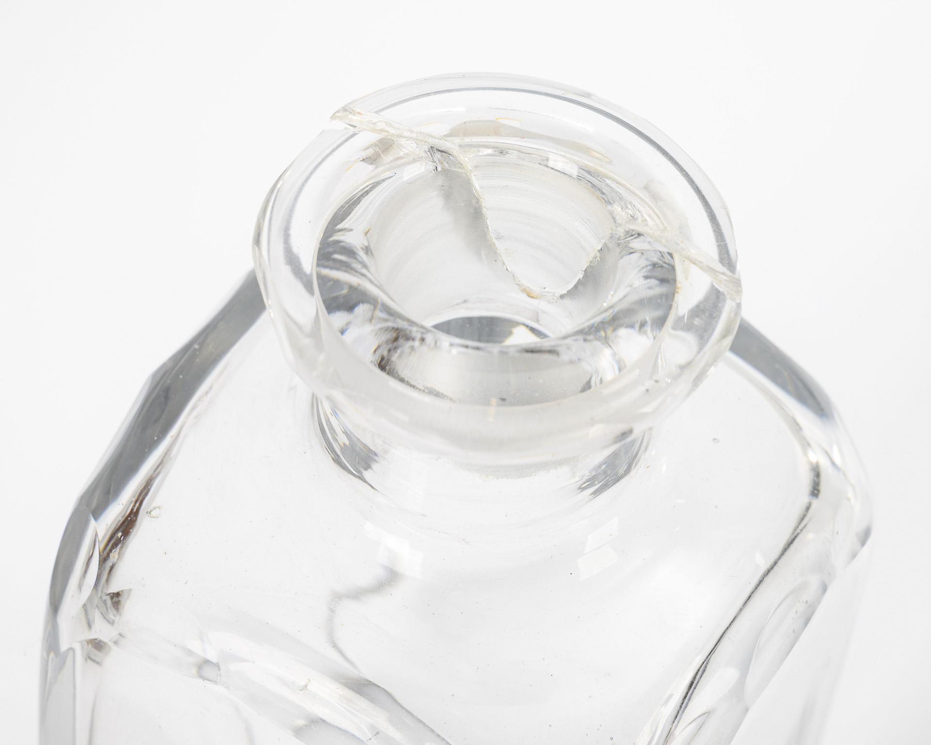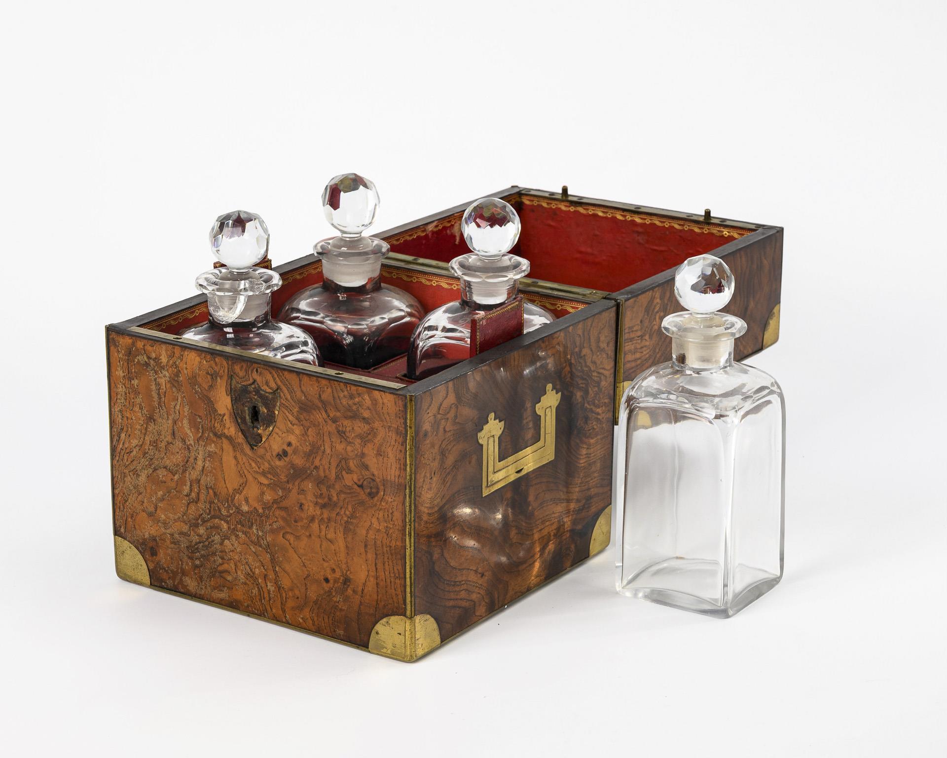 Annähernd würfelförmige Tischbar mit eingelassenen Messing-Beschlägen und Scharnierdeckel. Innen benummerte Fachungen für die originalen Flaschen mit Facettenschliff an der Schulter, Mündungsrand und Glasstöpsel. 1 Flaschenhals geklebt, Schlüssellochblende fehlt, einige Alters-/Gebrauchsspuren.
