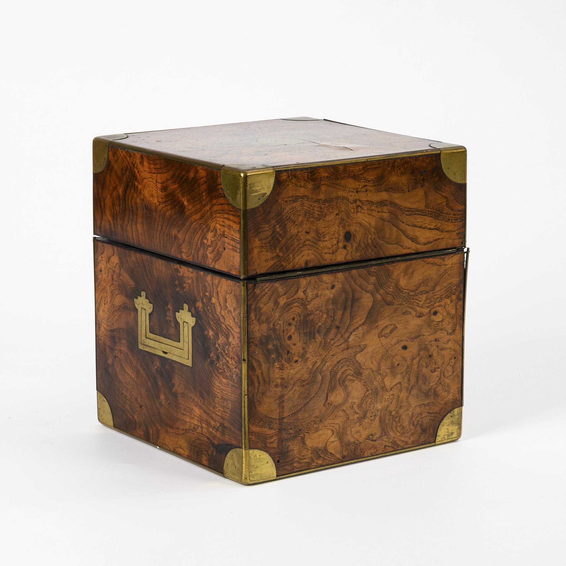 Blumenesche furniert, Messingbeschläge, innen roter Lederbezug, geblasenes farbloses Glas mit ausgekugeltem Abriss und Schliff. 23 x 20 x 20 cm.