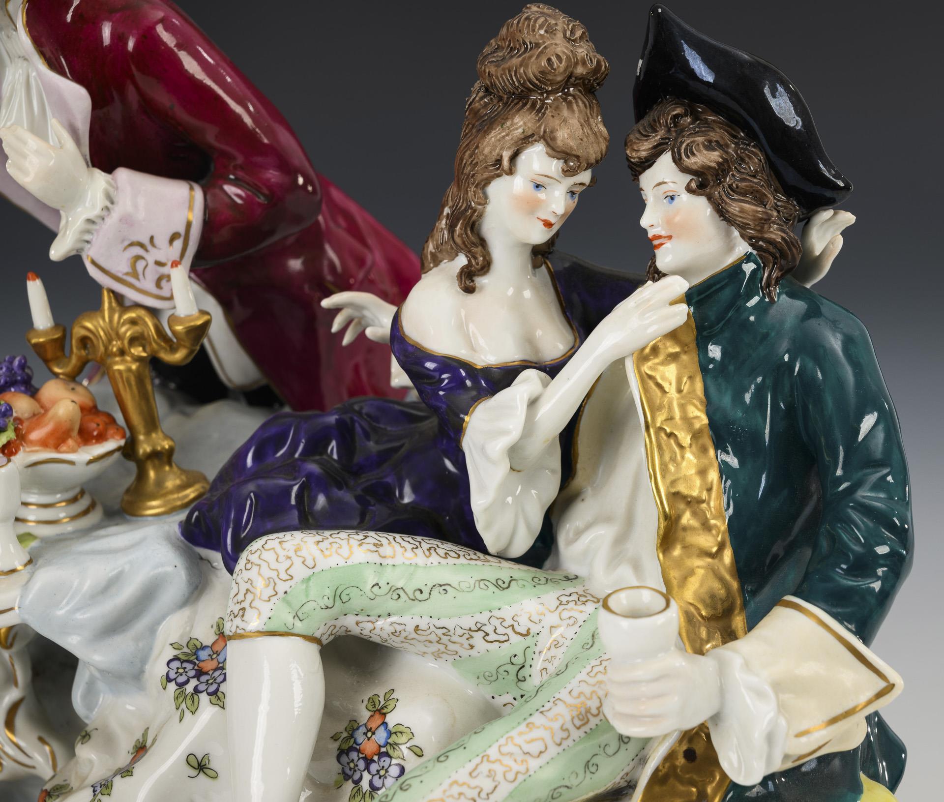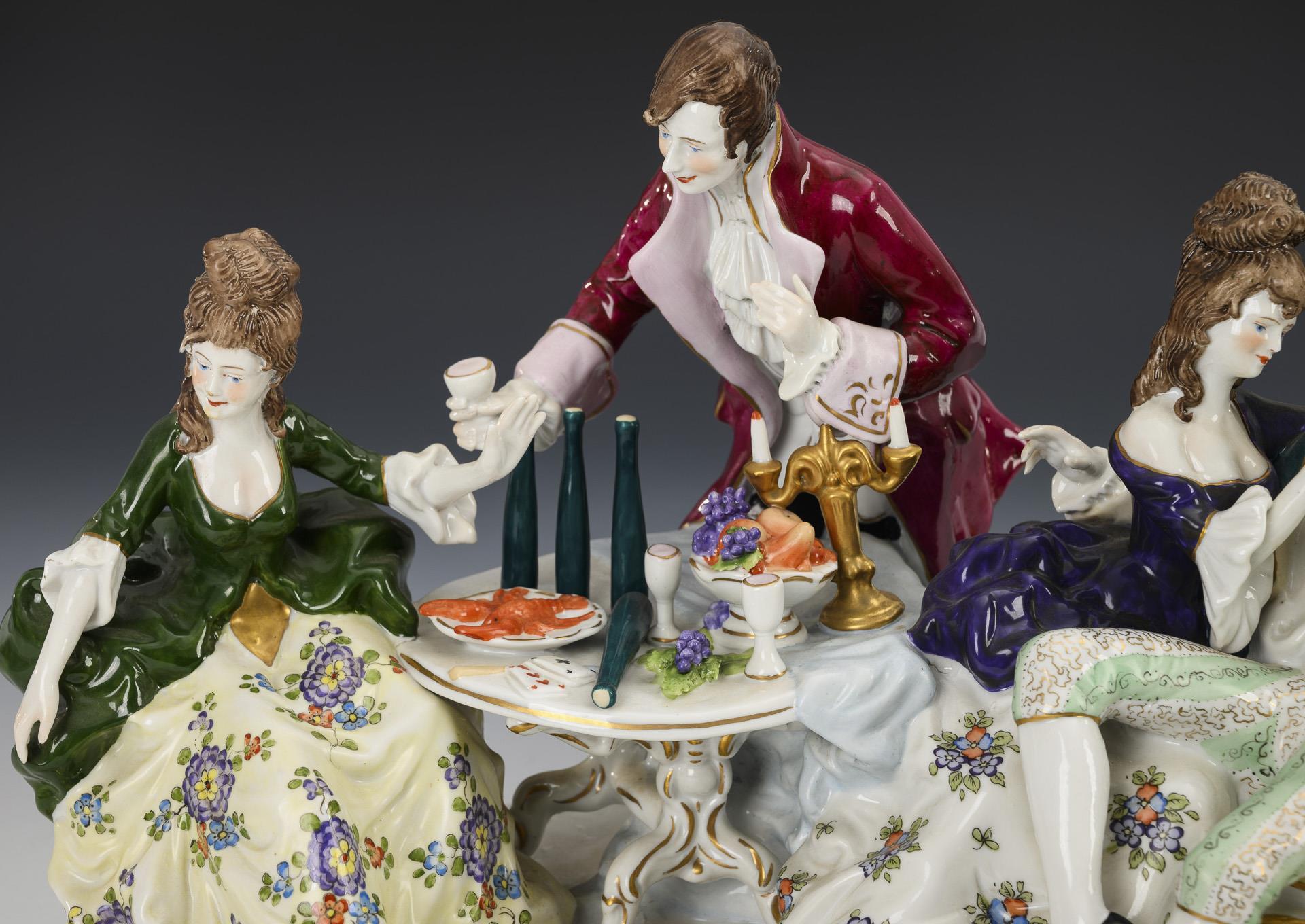 An einem gedeckten Tisch stehender, einer Dame ein Weinglas anbietender Herr sowie ein Liebespaar. Farbabplatzer am Dreispitz.